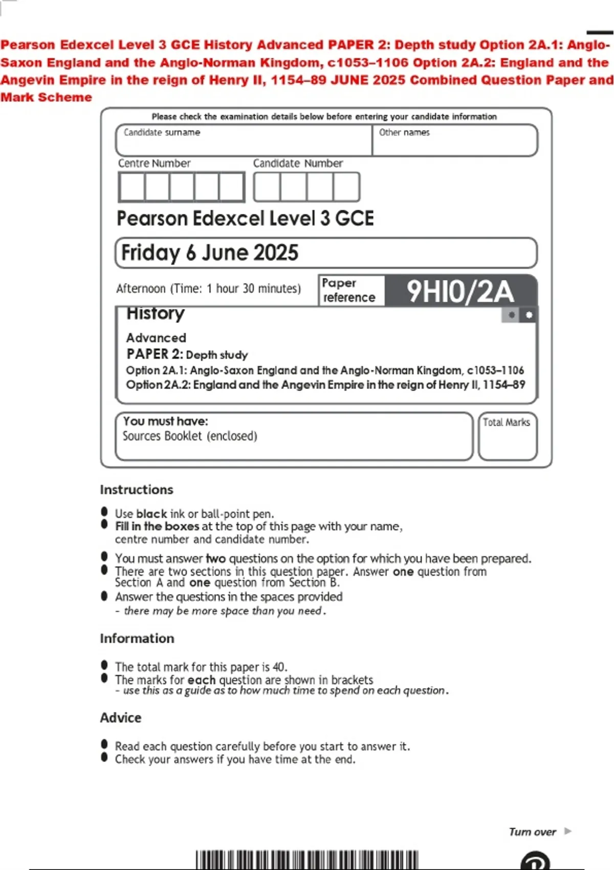 Pearson Edexcel Level 3 GCE History Advanced PAPER 2: Depth study Option 2A.1: Anglo Saxon England and the Anglo-Norman Kingdom, c1053–1106 Option 2A.2: England and the Angevin Empire in the reign of Henry II, 1154–89 JUNE 2025 Combined Question Paper and Mark Scheme