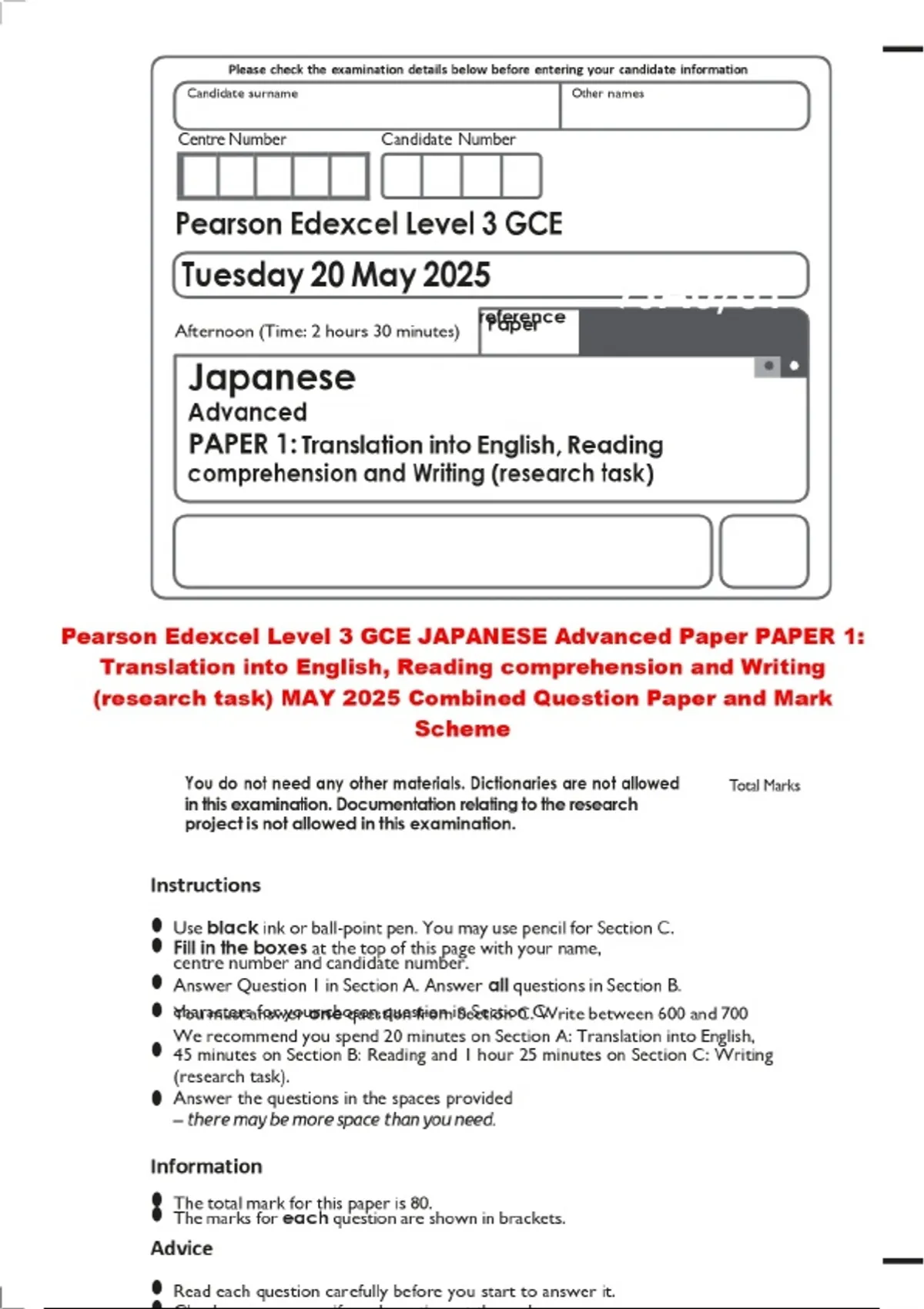 Pearson Edexcel Level 3 GCE JAPANESE Advanced Paper PAPER 1: Translation into English, Reading comprehension and Writing (research task) MAY 2025 Combined Question Paper and Mark Scheme