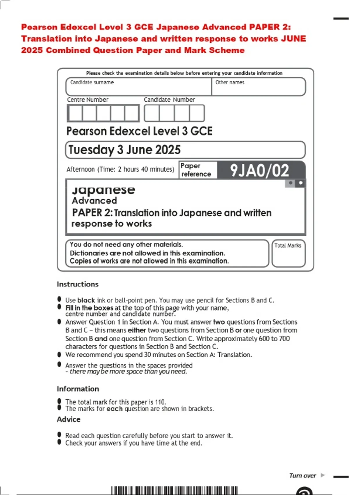 Pearson Edexcel Level 3 GCE Japanese Advanced PAPER 2: Translation into Japanese and written response to works JUNE 2025 Combined Question Paper and Mark Scheme