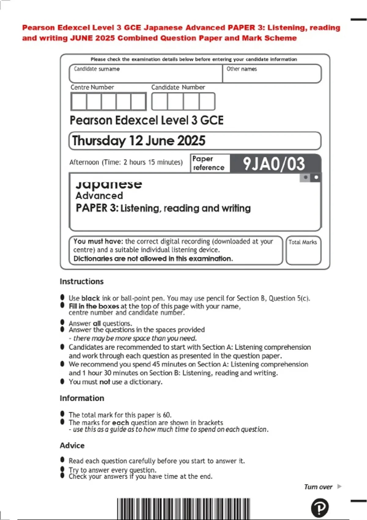 Pearson Edexcel Level 3 GCE Japanese Advanced PAPER 3: Listening, reading and writing JUNE 2025 Combined Question Paper and Mark Scheme