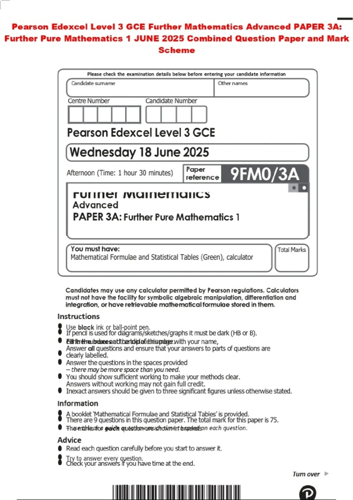 Pearson Edexcel Level 3 GCE Further Mathematics Advanced PAPER 3A: Further Pure Mathematics 1 JUNE 2025 Combined Question Paper and Mark Scheme