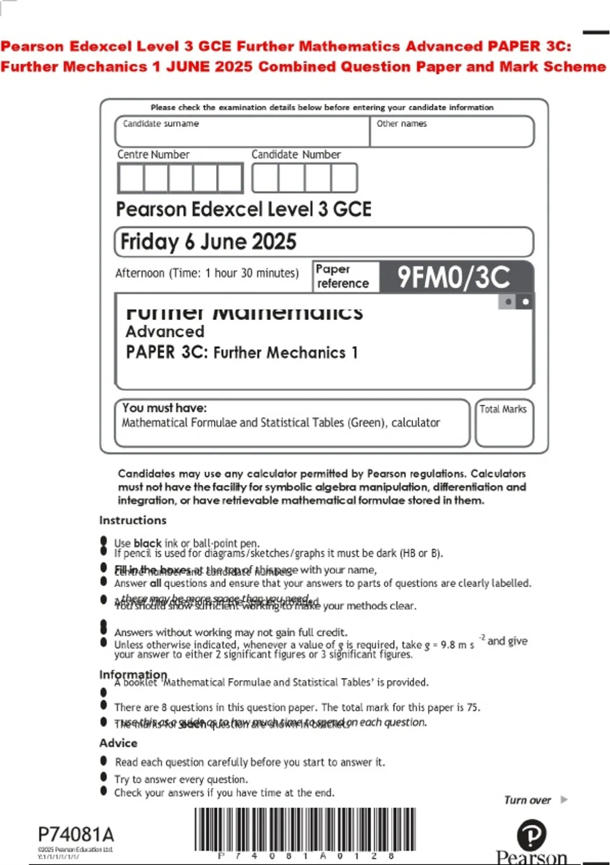 Pearson Edexcel Level 3 GCE Further Mathematics Advanced PAPER 3C: Further Mechanics 1 JUNE 2025 Combined Question Paper and Mark Scheme