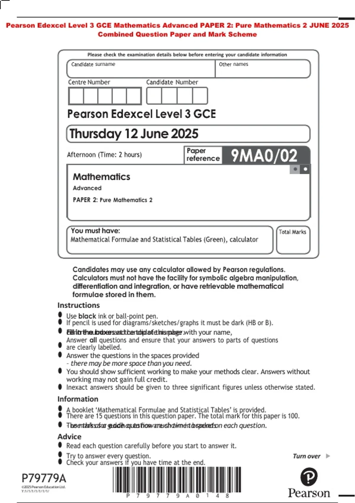 Pearson Edexcel Level 3 GCE Mathematics Advanced PAPER 2: Pure Mathematics 2 JUNE 2025