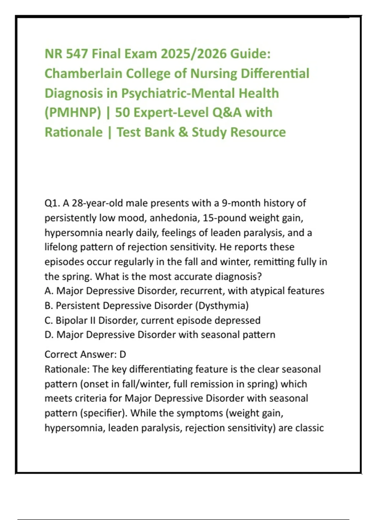NR 547 Final Exam 2025/2026 Guide: Chamberlain College of Nursing Differential Diagnosis in Psychiatric-Mental Health (PMHNP) | 50 Expert-Level Q&A with Rationale | Test Bank & Study Resource