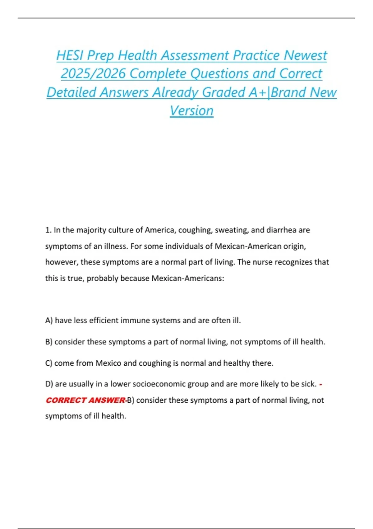 HESI Prep Health Assessment Practice Newest 2025/2026 Complete Questions and Correct Detailed Answers Already Graded A+|Brand New Version