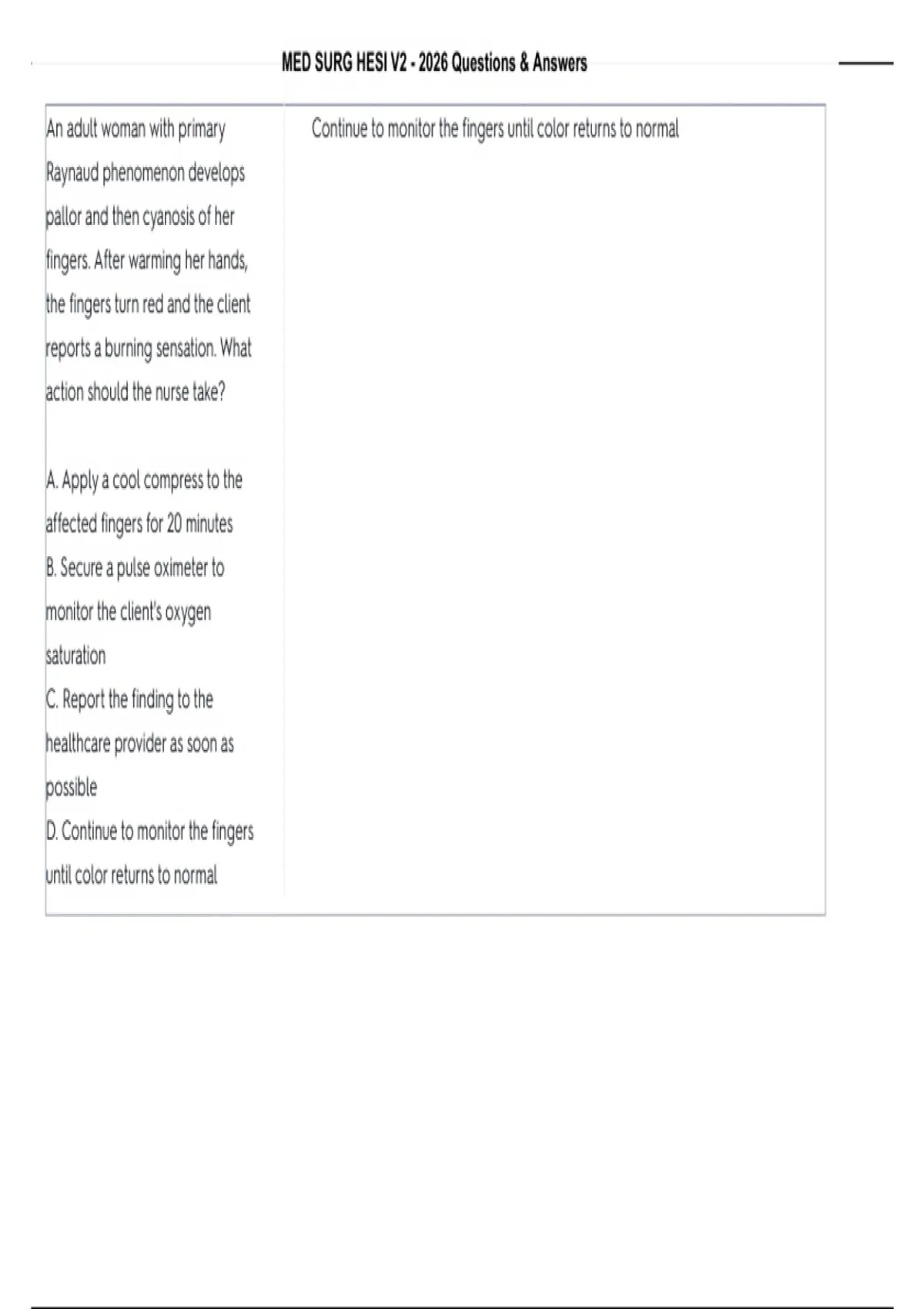 An adult woman with primary Continue to monitor the fingers until color returns to normal