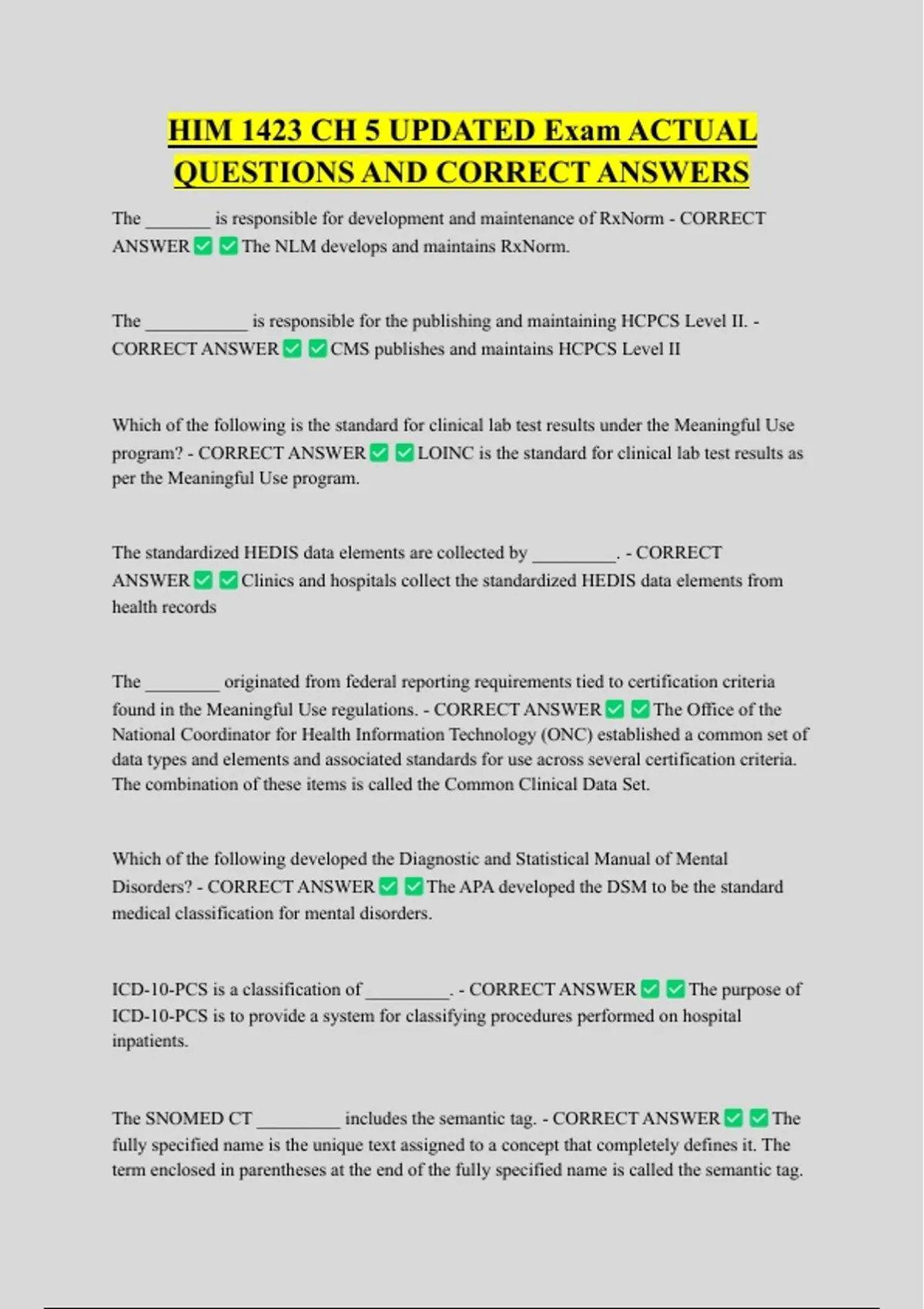 HIM 1423 CH 5 UPDATED Exam ACTUAL QUESTIONS AND CORRECT ANSWERS The _______ is responsible for development and maintenance of RxNorm - CORRECT ANSWER The NLM develops and maintains RxNorm. The ___________ is responsible for the publishing and maintaining HCPCS Level II. - CORRECT ANSWER CMS publishes and maintains HCPCS Level II Which of the following is the standard for clinical lab test results under the Meaningful Use program? - CORRECT ANSWER LOINC is the standard for clinical lab test results as per the Meaningful Use program. The standardized HEDIS data elements are collected by _________. - CORRECT ANSWER Clinics and hospitals collect the standardized HEDIS data elements from health records The ________ originated from federal reporting requirements tied to certification criteria found in the Meaningful Use regulations. - CORRECT ANSWER The Office of the National Coordinator for Health Information Technology (ONC) established a common set of data types and elements and associated standards for use across several certification criteria. The combination of these items is called the Common Clinical Data Set. Which of the following developed the Diagnostic and Statistical Manual of Mental Disorders? - CORRECT ANSWER The APA developed the DSM to be the standard medical classification for mental disorders. ICD-10-PCS is a classification of _________. - CORRECT ANSWER The purpose of ICD-10-PCS is to provide a system for classifying procedures performed on hospital inpatients.