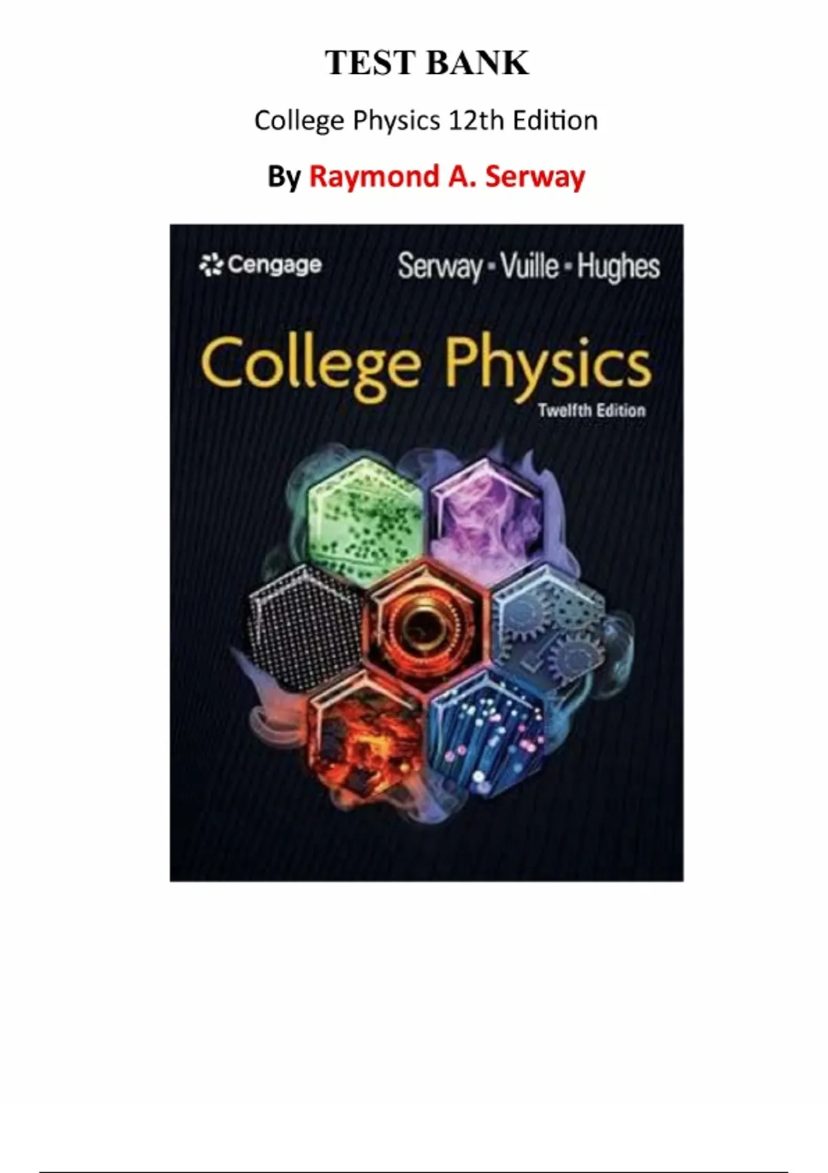 College Physics – 12th Edition, Raymond A. Serway – Complete Test Bank (Chapters 1–30)...Topic 1. Units, Trigonometry, and Vectors, Topic 2. Motion in One Dimension, Topic 3. Motion in Two Dimensions, Topic 4. Newton’s Laws of Motion, Topic 5. Energy, Topic 6. Momentum, Impulse, and Collisions, Topic 7. Rotational Motion and Gravitation, Topic 8. Rotational Equilibrium and Dynamics, Topic 9. Fluids and Solids, Topic 10. Thermal Physics, Topic 11. Energy in Thermal Processes, Topic 12. The Laws of Thermodynamics, Topic 13. Vibrations and Waves, Topic 14. Sound, Topic 15. Electric Forces and Fields, Topic 16. Electrical Energy and Capacitance, Topic 17. Current and Resistance, Topic 18. Direct-Current Circuits, Topic 19. Magnetism, Topic 20. Induced Voltages and Inductance, Topic 21. Alternating-Current Circuits and Electromagnetic Waves, Topic 22. Reflection and Refraction of Light, Topic 23. Mirrors and Lenses, Topic 24. Wave Optics, Topic 25. Optical Instruments, Topic 26. Relativity, Topic 27. Quantum Physics, Topic 28. Atomic Physics, Topic 29. Nuclear Physics, Topic 30. Nuclear Energy and Elementary Particles