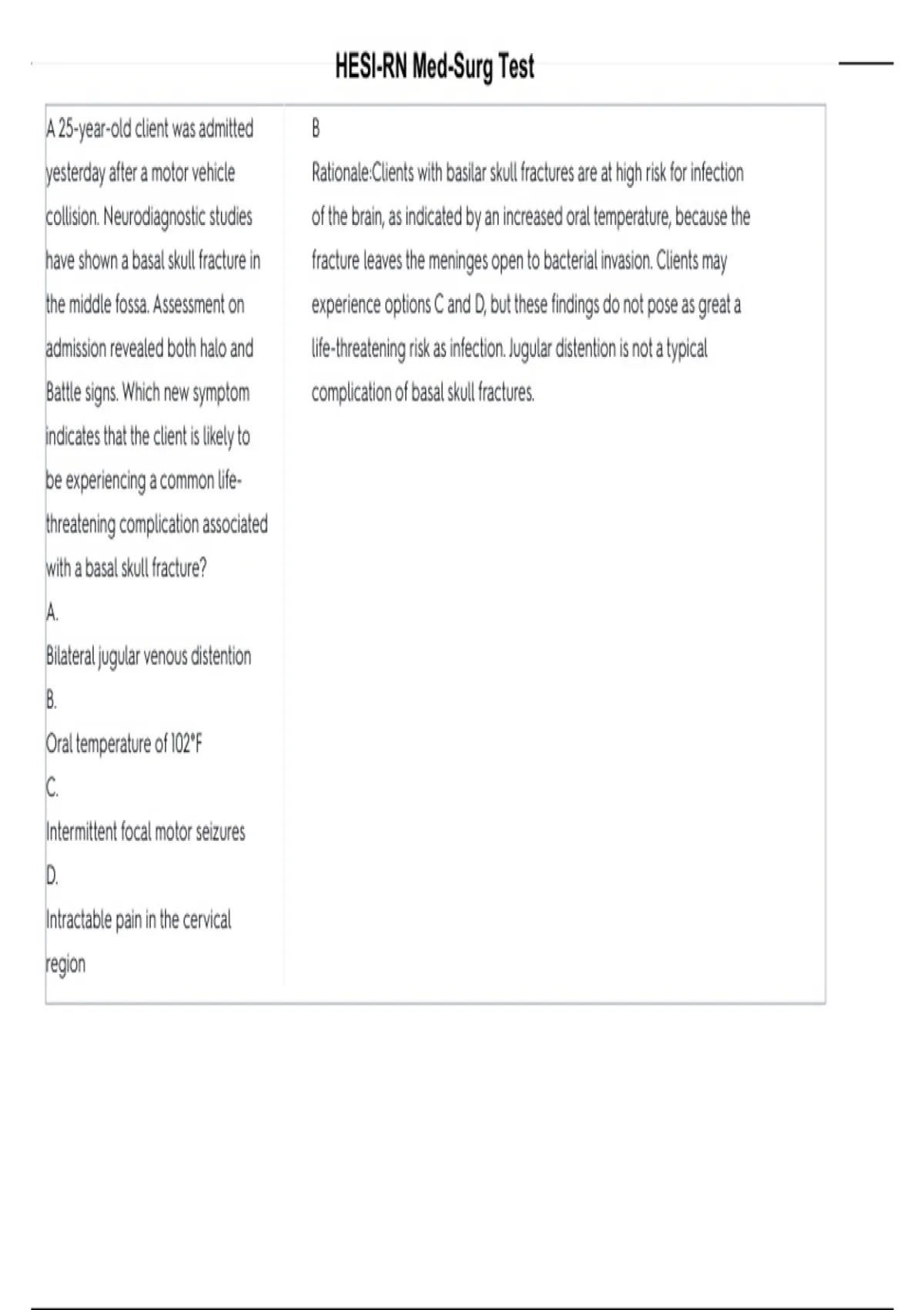 yesterday after a motor vehicle Rationale:Clients with basilar skull fractures are at high risk for infection