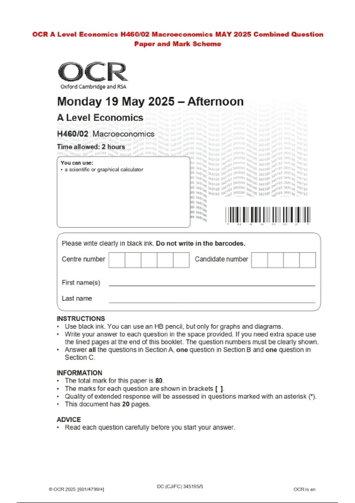 OCR A Level Economics H460/02 Macroeconomics MAY 2025 Combined Question Paper and Mark Scheme