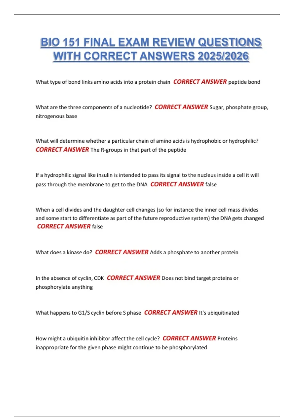 BIO 151 FINAL EXAM REVIEW QUESTIONS WITH CORRECT ANSWERS