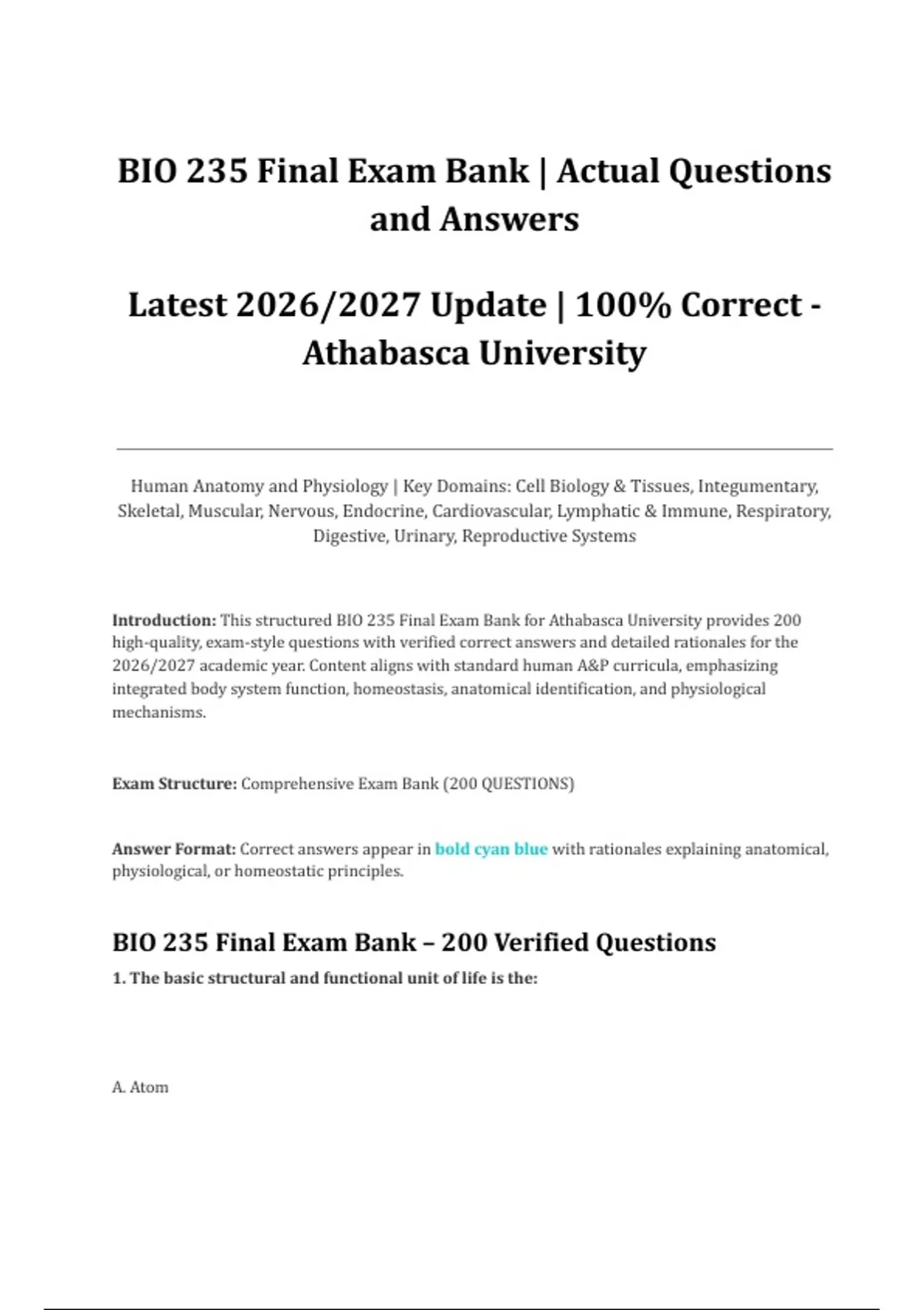 This document contains a comprehensive final exam bank for BIO 235 at Athabasca University, featuring actual exam-style questions with fully correct answers. It covers key biological concepts and systems addressed throughout the course, aligned with the latest 2026/2027 update. The material is suitable for in-depth review and effective preparation for the final examination.