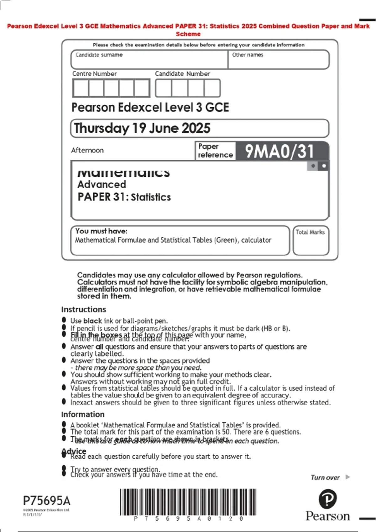 Pearson Edexcel Level 3 GCE Mathematics Advanced PAPER 31: Statistics 2025 Combined Question Paper and Mark Scheme