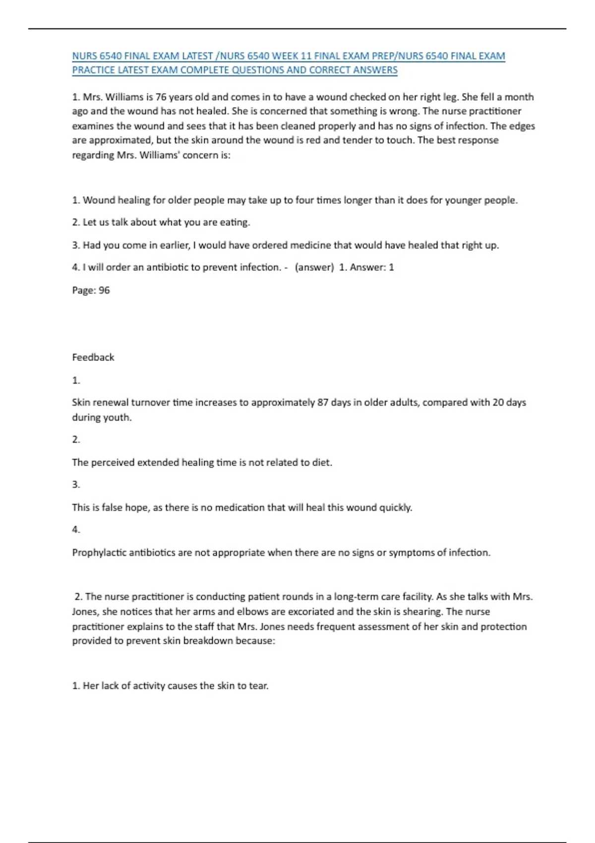 1. Mrs. Williams is 76 years old and comes in to have a wound checked on her right leg. She fell a month