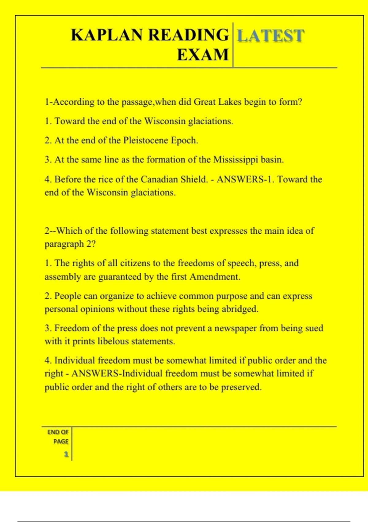 KAPLAN READING EXAM QUESTIONS AND ANSWERS 2026
