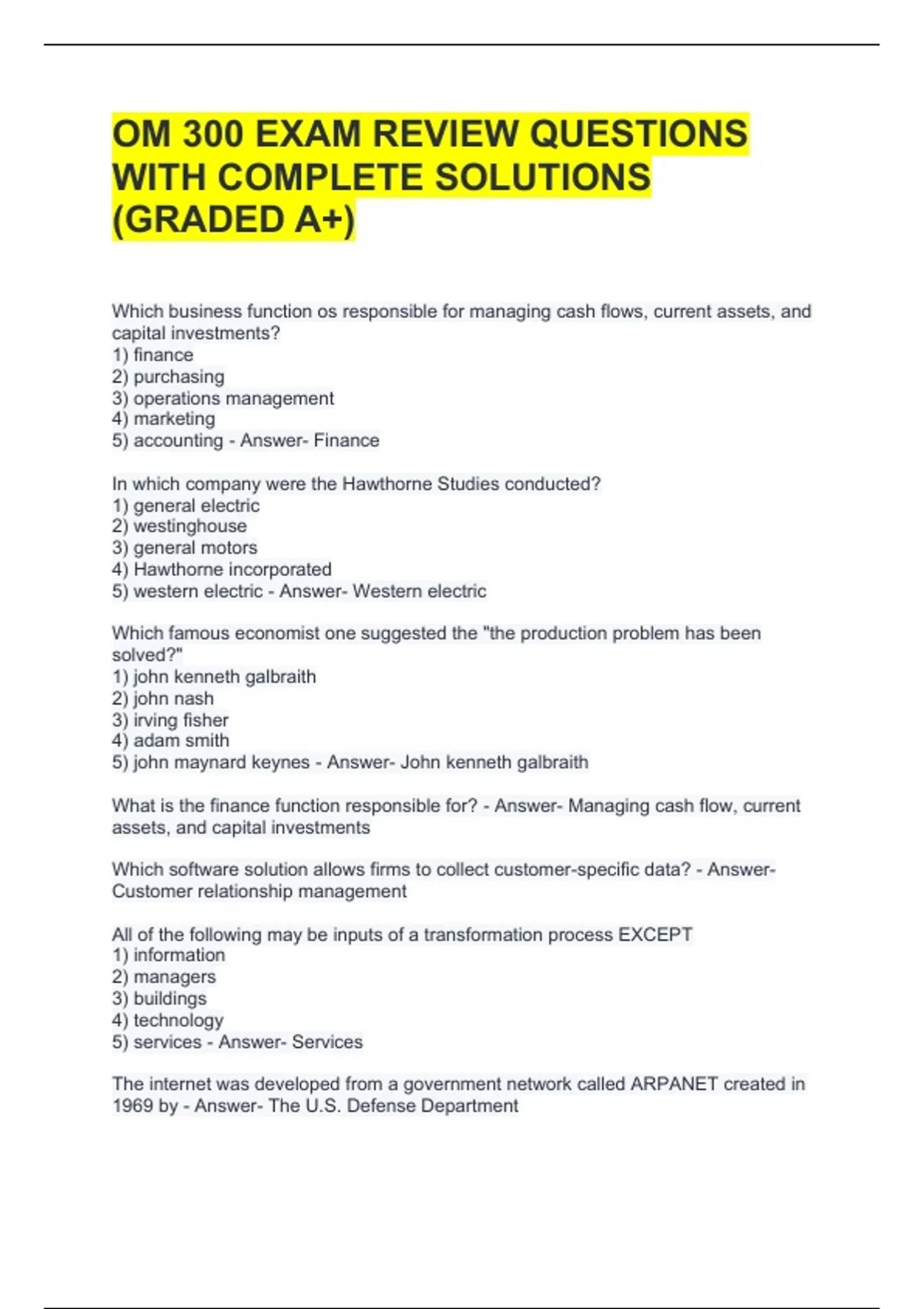OM 300 EXAM REVIEW QUESTIONS WITH COMPLETE SOLUTIONS (GRADED A+)