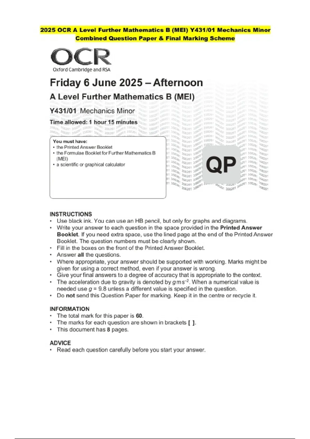 2025 OCR A Level Further Mathematics B (MEI) Y431/01 Mechanics Minor Combined Question Paper and Marking Scheme