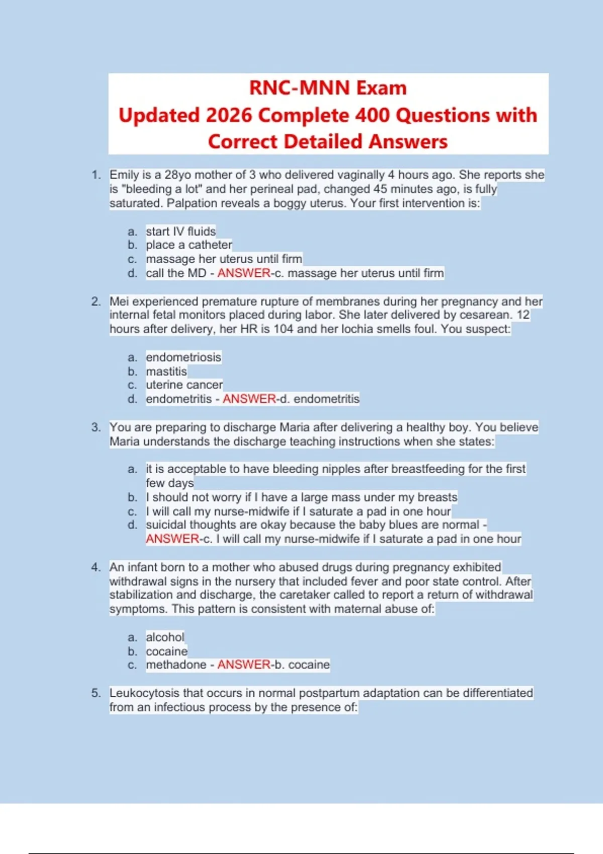 A comprehensive 2026 RNC-MNN (Maternal Newborn Nursing) exam preparation resource featuring 400+ practice questions with detailed answers. Topics include postpartum care, neonatal assessment, breastfeeding management, obstetric complications, pharmacology, and evidence-based nursing interventions. Ideal for nurses studying for certification or seeking to enhance clinical knowledge in maternal and newborn health. 1. Emily is a 28yo mother of 3 who delivered vaginally 4 hours ago. She reports she is "bleeding a lot" and her perineal pad, changed 45 minutes ago, is fully saturated. Palpation reveals a boggy uterus. Your first intervention is: a. start IV fluids b. place a catheter c. massage her uterus until firm d. call the MD - ANSWER-c. massage her uterus until firm 2. Mei experienced premature rupture of membranes during her pregnancy and her internal fetal monitors placed during labor. She later delivered by cesarean. 12 hours after delivery, her HR is 104 and her lochia smells foul. You suspect: a. endometriosis b. mastitis c. uterine cancer d. endometritis - ANSWER-d. endometritis 3. You are preparing to discharge Maria after delivering a healthy boy. You believe Maria understands the discharge teaching instructions when she states: a. it is acceptable to have bleeding nipples after breastfeeding for the first few days b. I should not worry if I have a large mass under my breasts c. I will call my nurse-midwife if I saturate a pad in one hour d. suicidal thoughts are okay because the baby blues are normal - ANSWER-c. I will call my nurse-midwife if I saturate a pad in one hour 4. An infant born to a mother who abused drugs during pregnancy exhibited withdrawal signs in the nursery that included fever and poor state control. After stabilization and discharge, the caretaker called to report a return of withdrawal symptoms. This pattern is consistent with maternal abuse of: a. alcohol b. cocaine c. methadone - ANSWER-b. cocaine