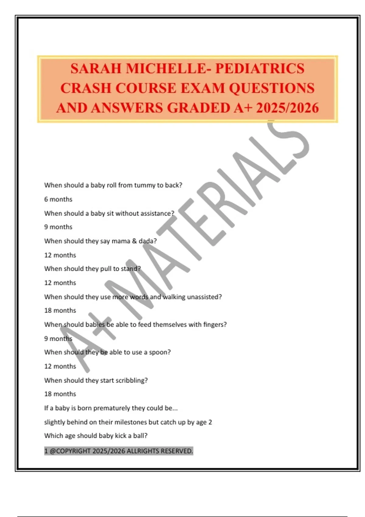 SARAH MICHELLE- PEDIATRICS CRASH COURSE EXAM QUESTIONS AND ANSWERS GRADED A+ 2025/2026