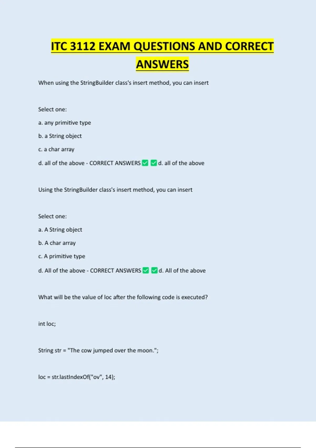 ITC 3112 EXAM QUESTIONS AND CORRECT ANSWERS When using the StringBuilder class's insert method, you can insert Select one: a. any primitive type b. a String object c. a char array d. all of the above - CORRECT ANSWERS d. all of the above Using the StringBuilder class's insert method, you can insert Select one: a. A String object b. A char array c. A primitive type d. All of the above - CORRECT ANSWERS d. All of the above What will be the value of loc after the following code is executed? int loc; String str = "The cow jumped over the moon."; loc = IndexOf("ov", 14);