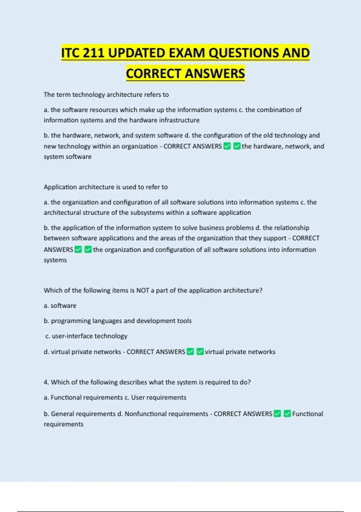 ITC 211 UPDATED EXAM QUESTIONS AND CORRECT ANSWERS The term technology architecture refers to a. the software resources which make up the information systems c. the combination of information systems and the hardware infrastructure b. the hardware, network, and system software d. the configuration of the old technology and new technology within an organization - CORRECT ANSWERS the hardware, network, and system software Application architecture is used to refer to a. the organization and configuration of all software solutions into information systems c. the architectural structure of the subsystems within a software application b. the application of the information system to solve business problems d. the relationship between software applications and the areas of the organization that they support - CORRECT ANSWERS the organization and configuration of all software solutions into information systems Which of the following items is NOT a part of the application architecture? a. software b. programming languages and development tools c. user-interface technology d. virtual private networks - CORRECT ANSWERS virtual private networks 4. Which of the following describes what the system is required to do? a. Functional requirements c. User requirements b. General requirements d. Nonfunctional requirements - CORRECT ANSWERS requirements