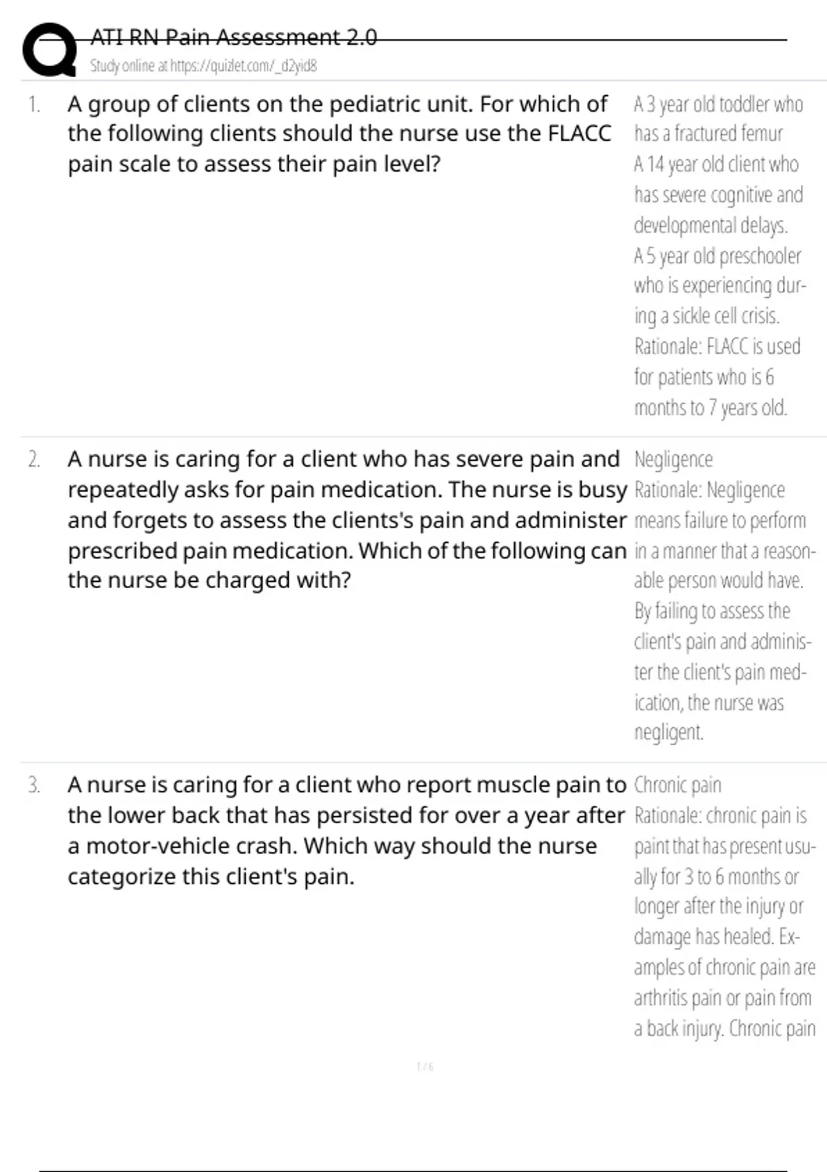 A group of clients on the pediatric unit. For which of the following clients should the nurse use the FLACC pain scale to assess their pain level? A 3 year old toddler who has a fractured femur A 14 year old client who has severe cognitive and developmental delays. A 5 year old preschooler who is experiencing dur- ing a sickle cell crisis. Rationale: FLACC is used for patients who is 6 months to 7 years old. 2. A nurse is caring for a client who has severe pain and repeatedly asks for pain medication. The nurse is busy and forgets to assess the clients's pain and administer prescribed pain medication. Which of the following can the nurs