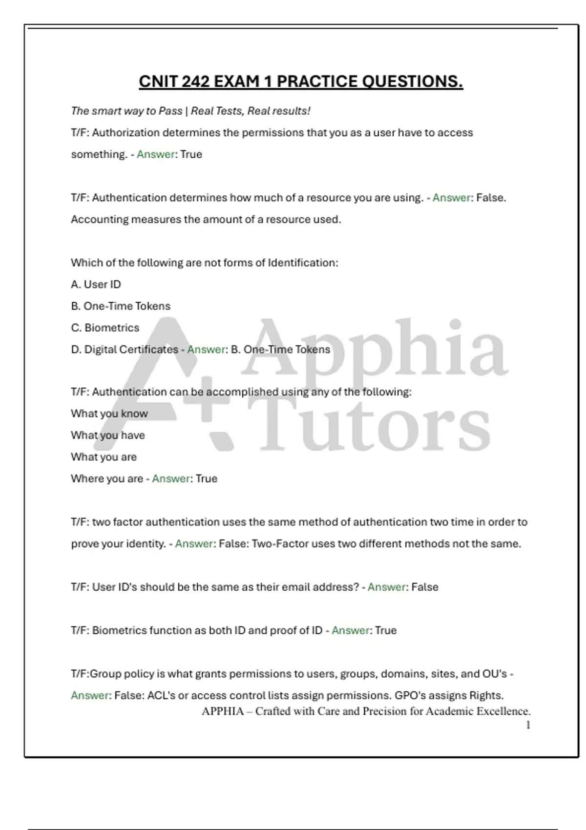 T/F: Authentication determines how much of a resource you are using. - Answer: False.
