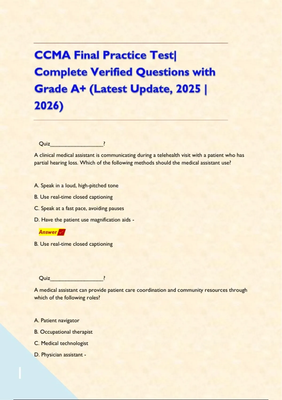CCMA Final Practice Test| Complete Verified Questions with Grade A+ (Latest Update, 2025 | 2026) Quiz_________________? A clinical medical assistant is communicating during a telehealth visit with a patient who has partial hearing loss. Which of the following methods should the medical assistant use? A. Speak in a loud, high-pitched tone B. Use real-time closed captioning C. Speak at a fast pace, avoiding pauses D. Have the patient use magnification aids - Answer B. Use real-time closed captioning Quiz_________________? A medical assistant can provide patient care coordination and community resources through which of the following roles? A. Patient navigator B. Occupational therapist C. Medical technologist D. Physician assistant - Answer A. Patient navigator Quiz_________________? A medical assistant discovers a garbage can fire has started in the break room of the medical office. According to the RACE acronym for emergency response, which of the following actions should the assistant take first? A. Close the doors and windows B. Turn off the oxygen in the adjacent examination rooms C. Use the office fire extinguisher D. Evacuate staff and patient from the immediate area - Answer D. Evacuate staff and patient from the immediate area Quiz_________________? A medical assistant has a prescription to obtain a CBC, basic metabolic panel, lactic acid, and a PT/INR from an older adult patient who has small veins. Which of the following methods of draw should the assistant use? A. Evacuated system method B. Butterfly method C. Syringe method D. Capillary method - Answer B. Butterfly method Quiz_________________? A medical assistant has just finished disinfecting a patient examination room. When should the assistant remove their personal protective equipment (PPE)? A. Remove PPE before leaving the patient examination room B. Leave the patient examination room and remove PPE in the employee restroom C. Remove PPE in hallway and place in hallway trashcan D. Before patient leaves, ask for help removing the PPE - Answer A. Remove PPE before leaving the patient examination room Quiz_________________? A medical assistant in an acute care facility is checking in a patient who has a deep laceration. The patient tells the assistant they cannot accept blood transfusions due to their religious beliefs. Which of the following actions should the assistant take? A. Document the statement in the patient's medical record B. Obtain a specimen for blood type cross and match C. Inform the patient a transfusion is mandatory for their treatment D. Have the patient sign an Against Medical Advice (AMA) form - Answer A. Document the statement in the patient's medical record Quiz_________________? A medical assistant is administering ear drops to an adult patient. Which of the following actions should the assistant take? A. Hold the dropper at least 2.5 cm (1 in) above the ear canal B. Have the patient lie supine on the examination table C. Pull the pinna down and back before instilling the drops D. Warm the medication bottle before instilling the drops - Answer D. Warm the medication bottle before instilling the drops Quiz_________________? A medical assistant is assisting a patient from a wheelchair to an examination table. Which of the following assistive devices should the assistant use to ensure patient safety when transferring? A. Walker B. Cane C. Crutches D. Gait belt - Answer D. Gait belt Quiz_________________? A medical assistant is assisting with the examination of an older adult patient who has a forward, rounded curvature of the thoracic spine. Which of the following terms should the assistant use when documenting this finding in the patient's medical record? A. Lordosis B. Subluxation C. Kyphosis D. Scoliosis - Answer C. Kyphosis Quiz_________________? A medical assistant is caring for a child who has varicella zoster virus. The assistant should recognize that varicella is spread through which of the following modes of transmission? A. Airborne B. Bloodborne C. Vector-borne D. Foodborne - Answer A. Airborne