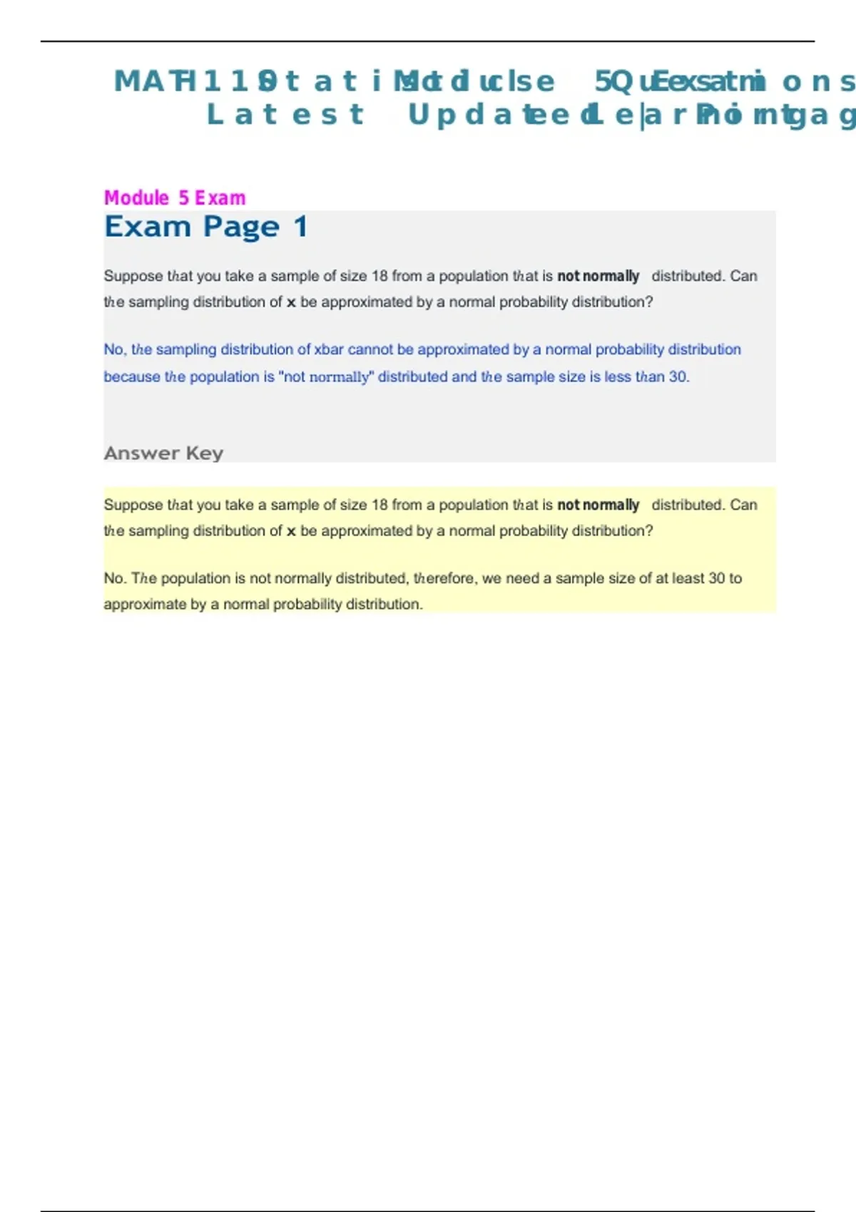 This document provides exam questions for Module 5 of the MATH 110 Statistics course offered by Portage Learning. It covers the key statistical concepts, formulas, and problem-solving techniques assessed in Module 5, aligned with course learning objectives. The material is structured to support focused review and reinforce accurate understanding of statistics topics relevant to this module.