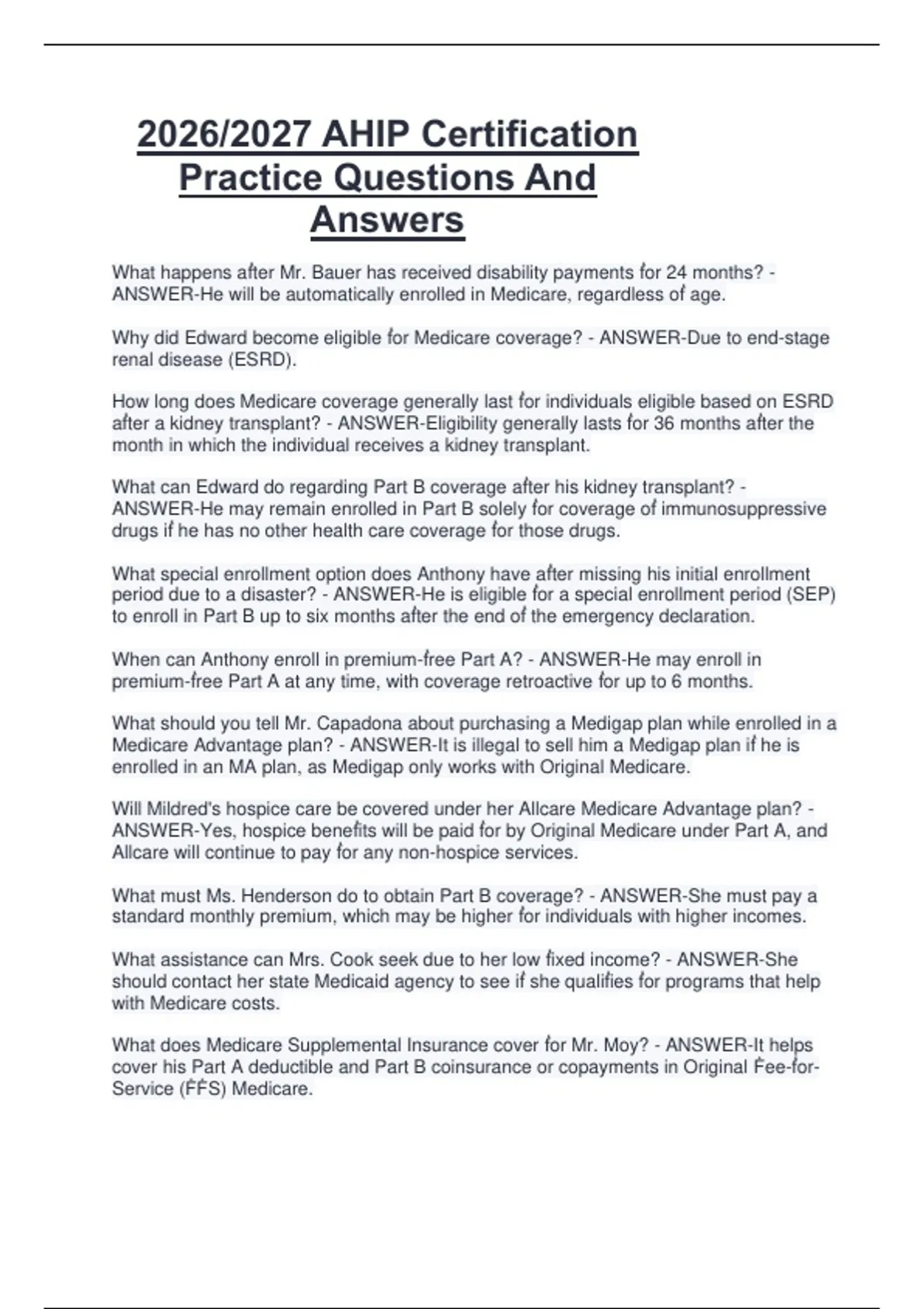 This document features a comprehensive collection of AHIP Certification practice questions with accurate answers for the 2026/2027 certification year. It covers essential topics including Medicare basics, enrollment periods, Medicare Advantage plans, Part D prescription drug coverage, compliance standards, fraud waste and abuse, and marketing guidelines. The content is structured to strengthen understanding and support effective preparation for the official AHIP exam.