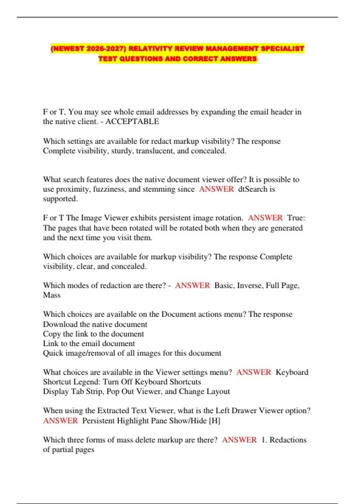 (NEWEST ) RELATIVITY REVIEW MANAGEMENT SPECIALIST TEST QUESTIONS AND CORRECT ANSWERS....
