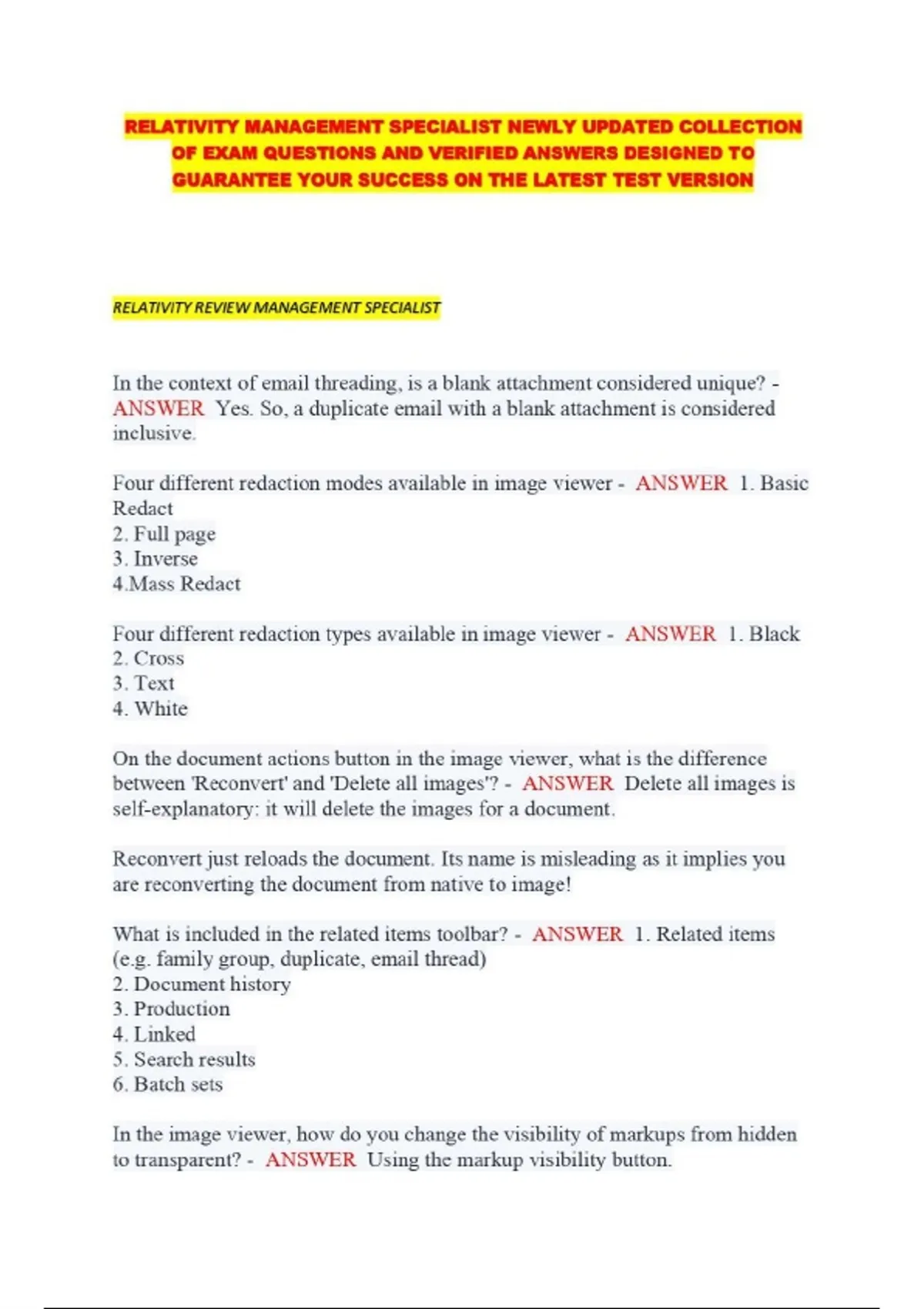 RELATIVITY MANAGEMENT SPECIALIST NEWLY UPDATED COLLECTION OF EXAM QUESTIONS AND VERIFIED ANSWERS DESIGNED TO GUARANTEE YOUR SUCCESS ON THE LATEST TEST VERSION