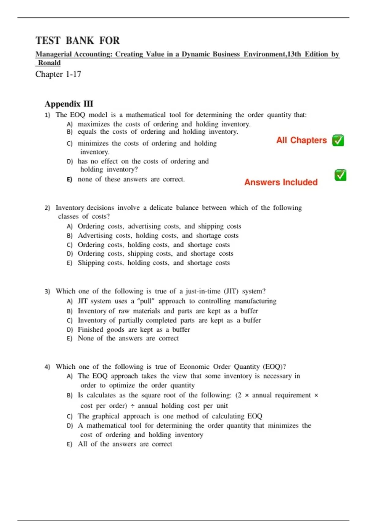 This document provides the complete Test Bank for Managerial Accounting: Creating Value in a Dynamic Business Environment (13th Edition) by Hilton. It includes chapter-by-chapter multiple-choice questions, analytical problems, and application-based items with detailed answer explanations. Topics include cost behavior, cost-volume-profit analysis, activity-based costing, budgeting, standard costing, variance analysis, performance measurement, pricing decisions, and strategic cost management. This comprehensive test bank is ideal for exam preparation, coursework support, and instructor assessment use.