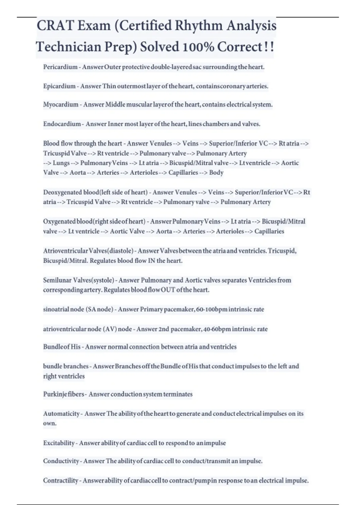 This document provides a complete preparation resource for the CRAT (Certified Rhythm Analysis Technician) exam, featuring solved practice questions with verified correct answers. It focuses on core rhythm analysis concepts, ECG interpretation, cardiac arrhythmias, and exam-relevant scenarios to support effective exam readiness.