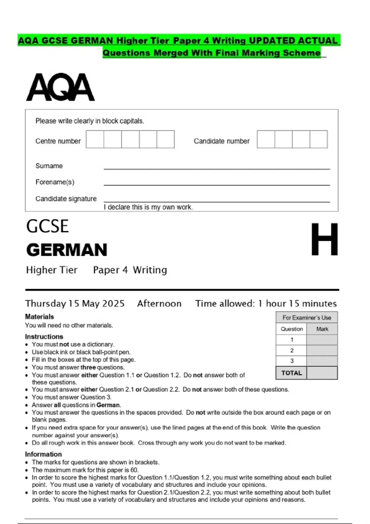 AQA GCSE GERMAN Higher Tier Paper 4 Writing UPDATED ACTUAL Questions Merged With Final Marking Scheme