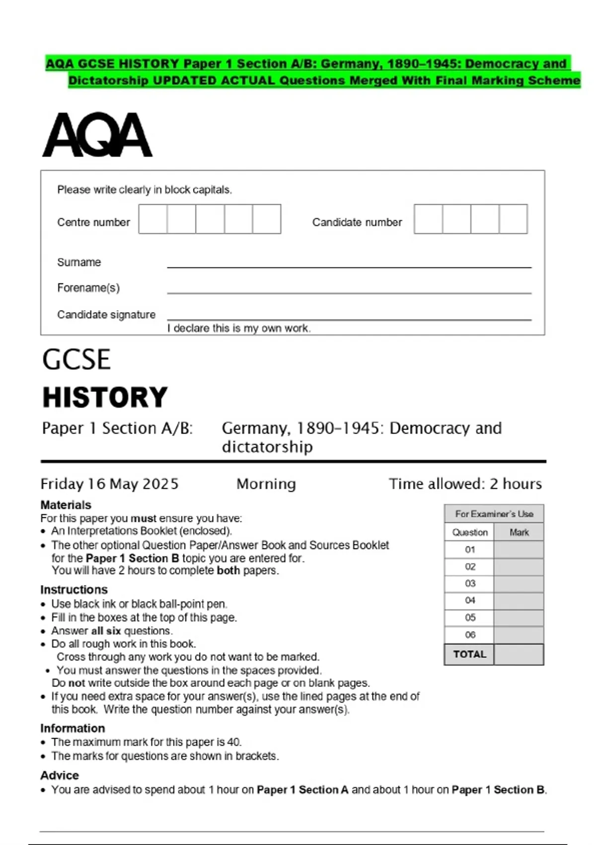 AQA GCSE HISTORY Paper 1 Section A/B: Germany, 1890–1945: Democracy and Dictatorship UPDATED ACTUAL Questions Merged With Final Marking Scheme
