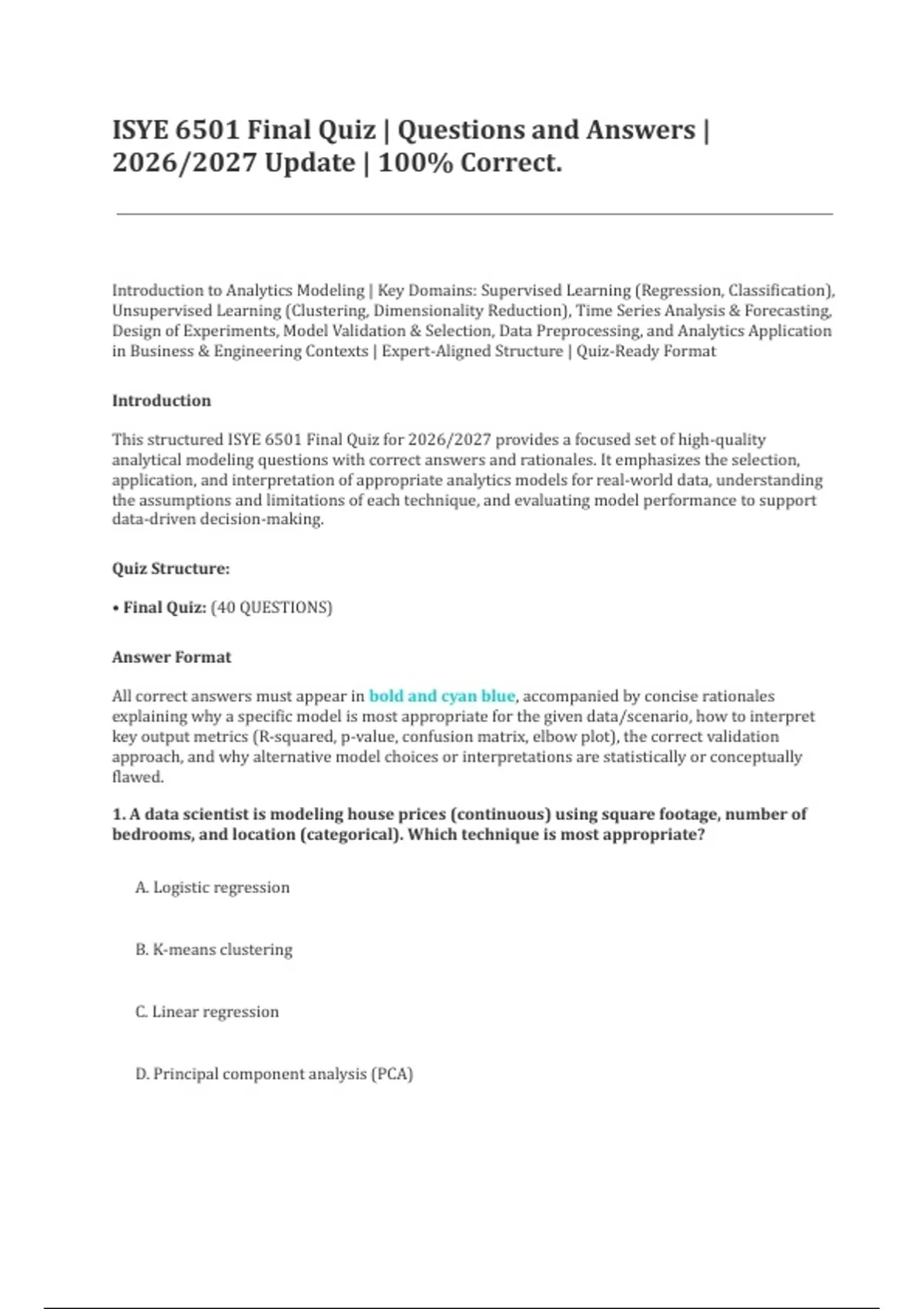 This structured ISYE 6501 Final Quiz for 2026/2027 provides a focused set of high-quality