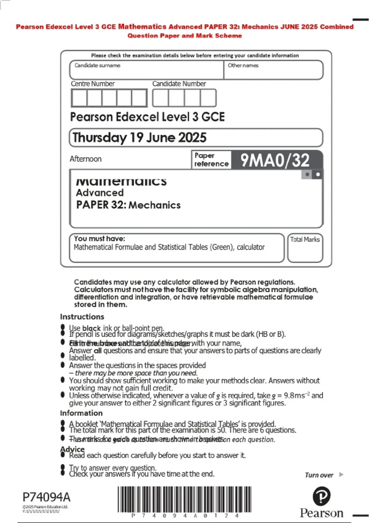 Pearson Edexcel Level 3 GCE Mathematics Advanced PAPER 32: Mechanics JUNE 2025 Combined Question Paper and Mark Scheme