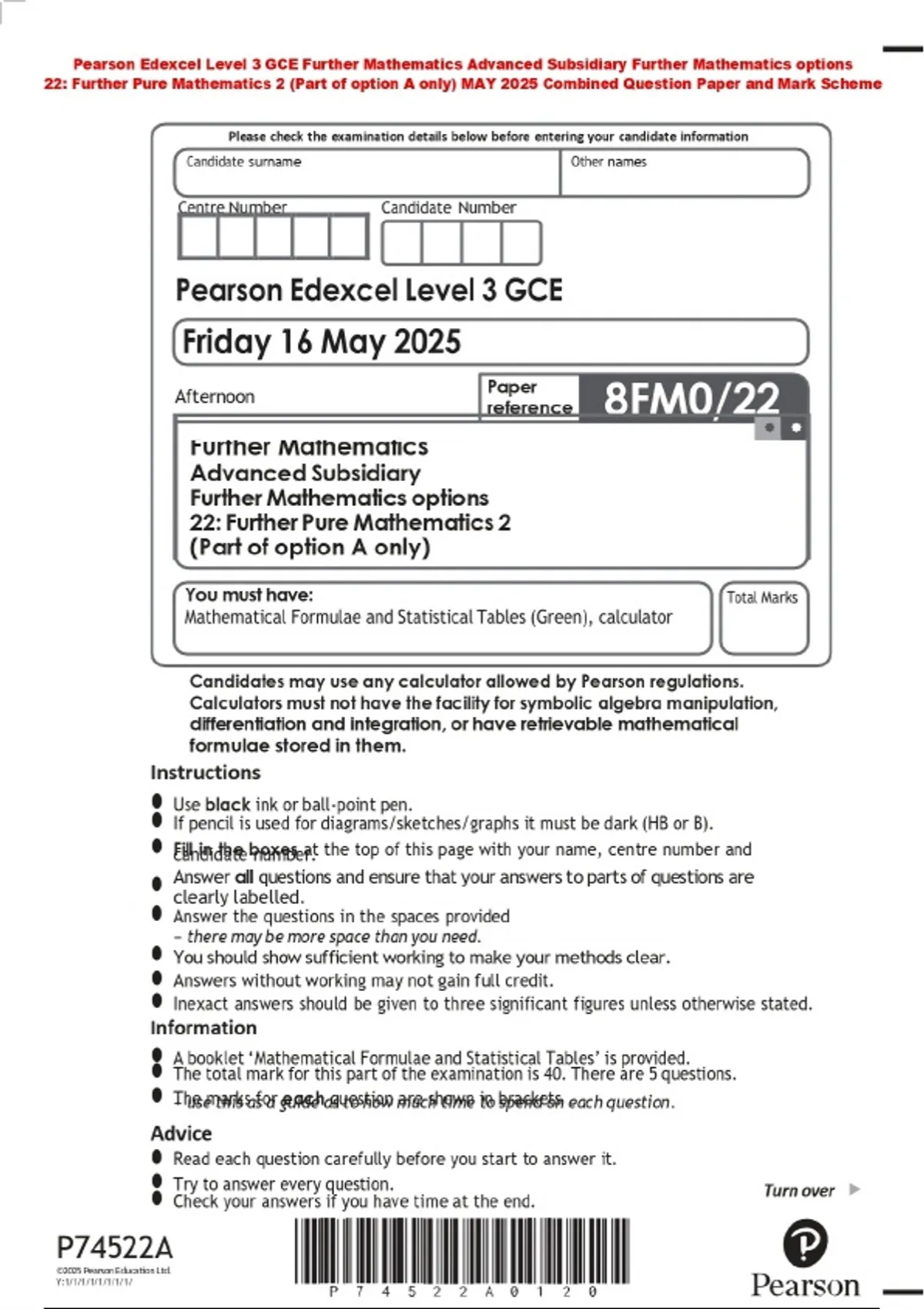 Pearson Edexcel Level 3 GCE Further Mathematics Advanced Subsidiary Further Mathematics options 22: Further Pure Mathematics 2 (Part of option A only) MAY 2025 Combined Question Paper and Mark Scheme