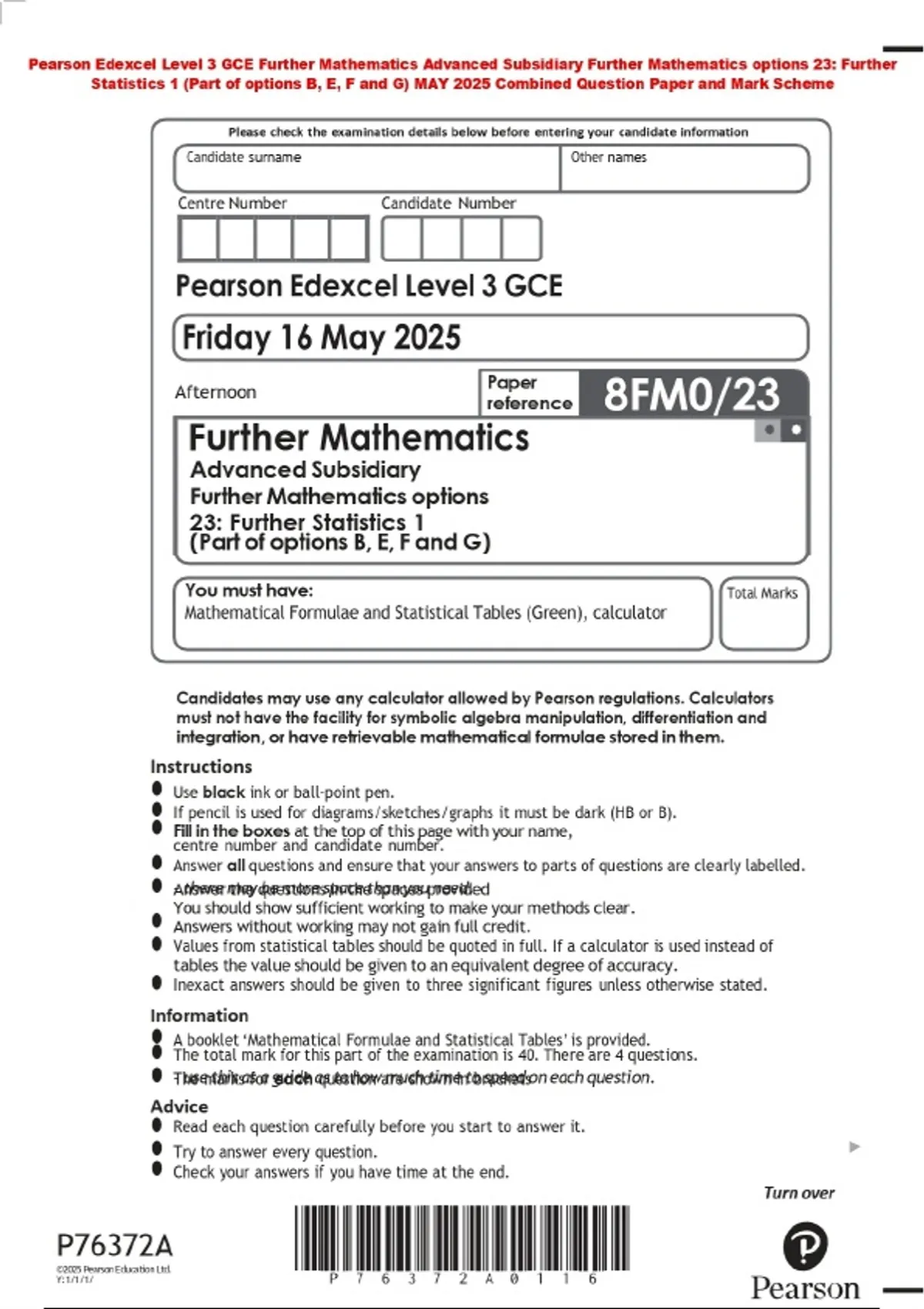 Pearson Edexcel Level 3 GCE Further Mathematics Advanced Subsidiary Further Mathematics options 23: Further Statistics 1 (Part of options B, E, F and G) MAY 2025 Combined Question Paper and Mark Scheme