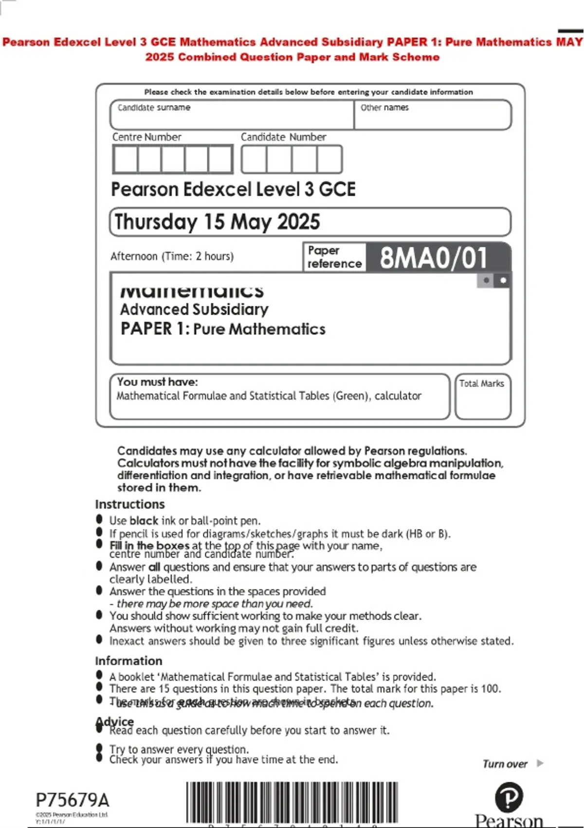 Pearson Edexcel Level 3 GCE Mathematics Advanced Subsidiary PAPER 1: Pure Mathematics MAY 2025 Combined Question Paper and Mark Scheme