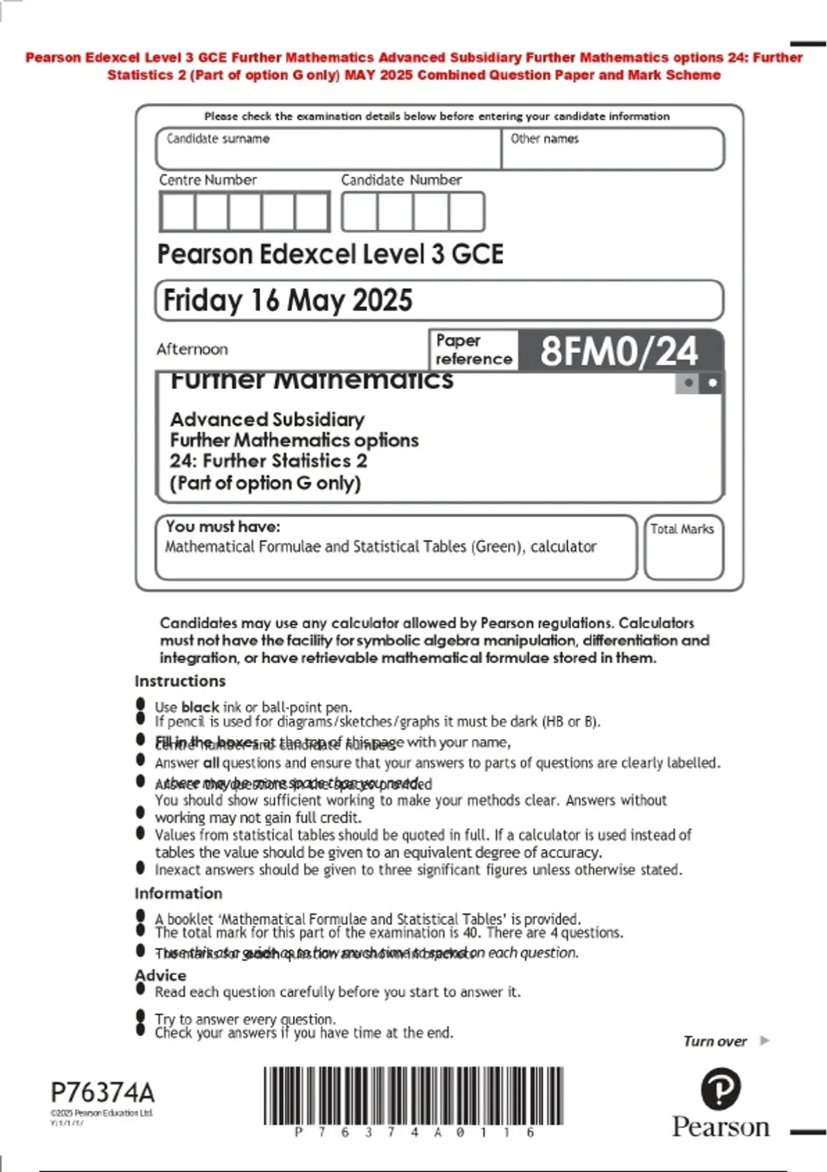 Pearson Edexcel Level 3 GCE Further Mathematics Advanced Subsidiary Further Mathematics options 24: Further Statistics 2 (Part of option G only) MAY 2025 Combined Question Paper and Mark Scheme
