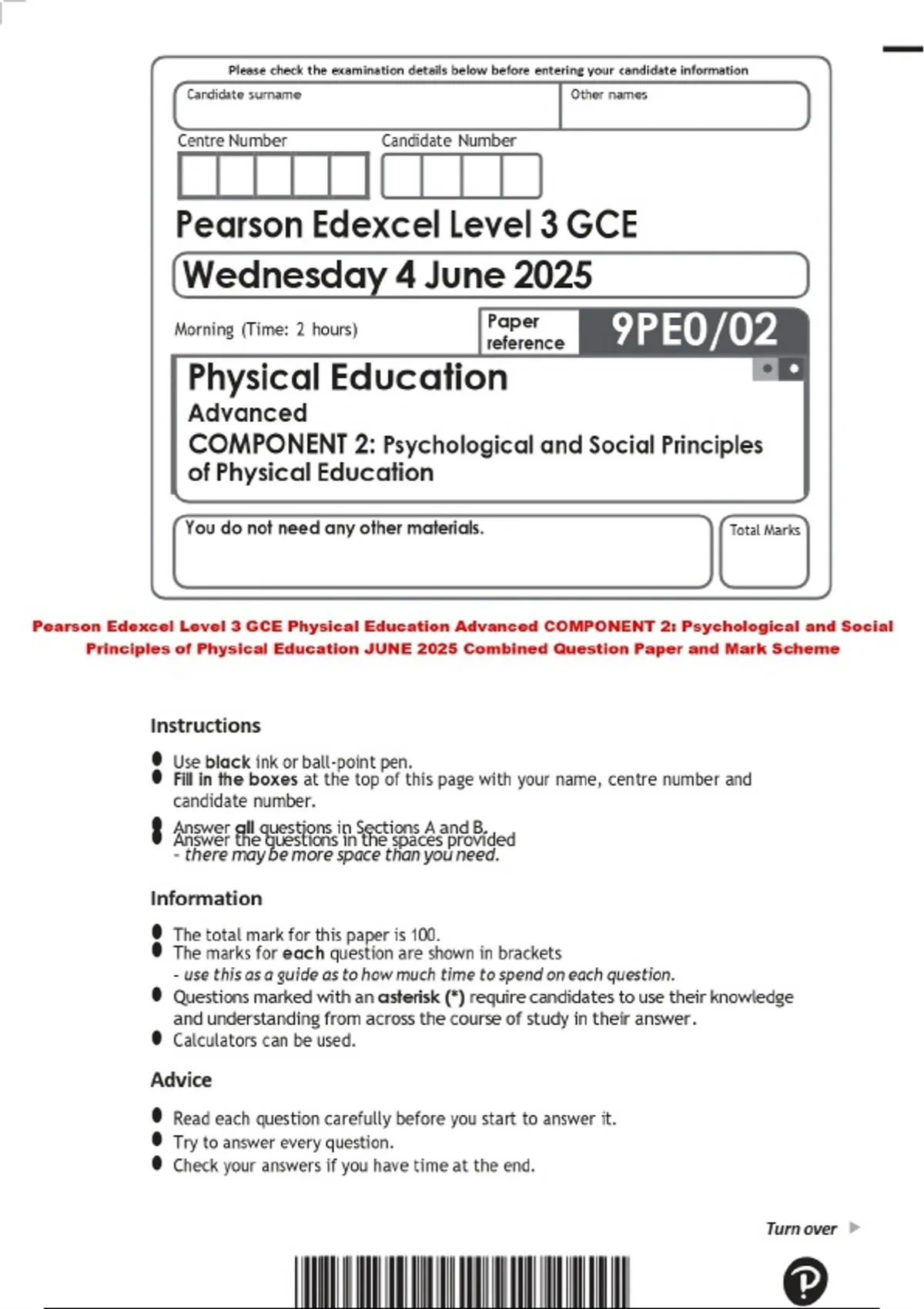 Pearson Edexcel Level 3 GCE Physical Education Advanced COMPONENT 2: Psychological and Social Principles of Physical Education JUNE 2025 Combined Question Paper and Mark Scheme