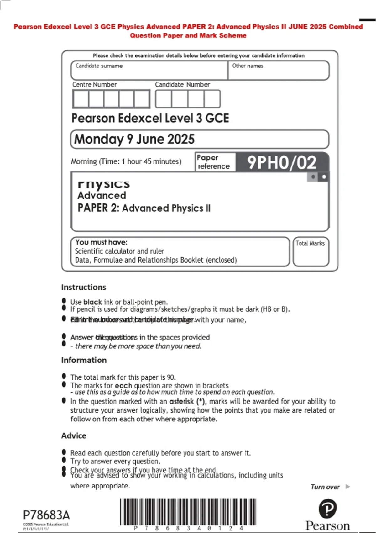 Pearson Edexcel Level 3 GCE Physics Advanced PAPER 2: Advanced Physics II JUNE 2025 Combined Question Paper and Mark Scheme