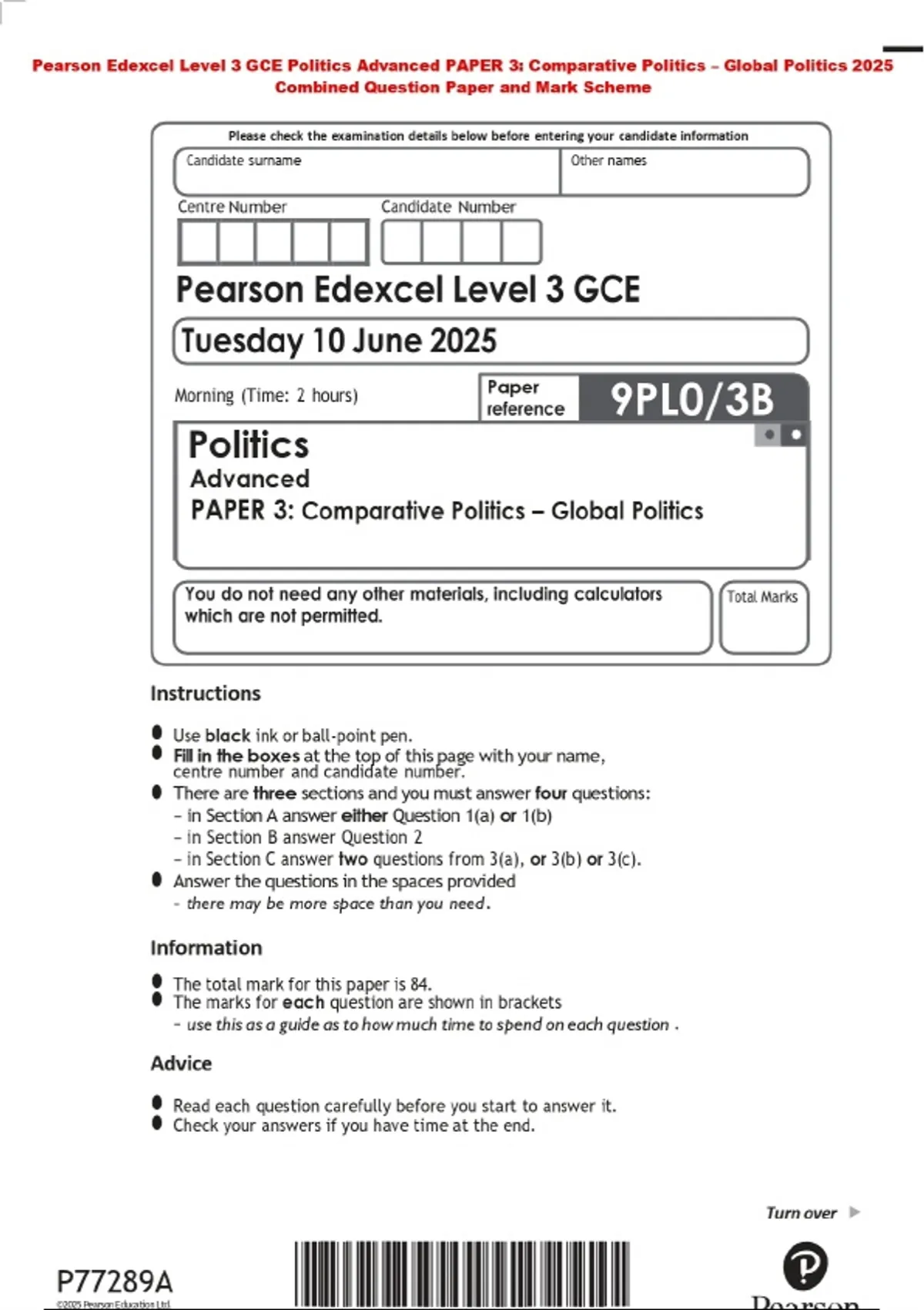 Pearson Edexcel Level 3 GCE Politics Advanced PAPER 3: Comparative Politics – Global Politics 2025 Combined Question Paper and Mark Scheme
