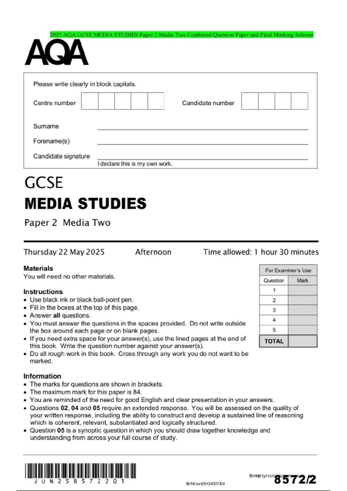 2025 AQA GCSE MEDIA STUDIES Paper 2 Media Two Combined Question Paper and Final Marking Scheme
