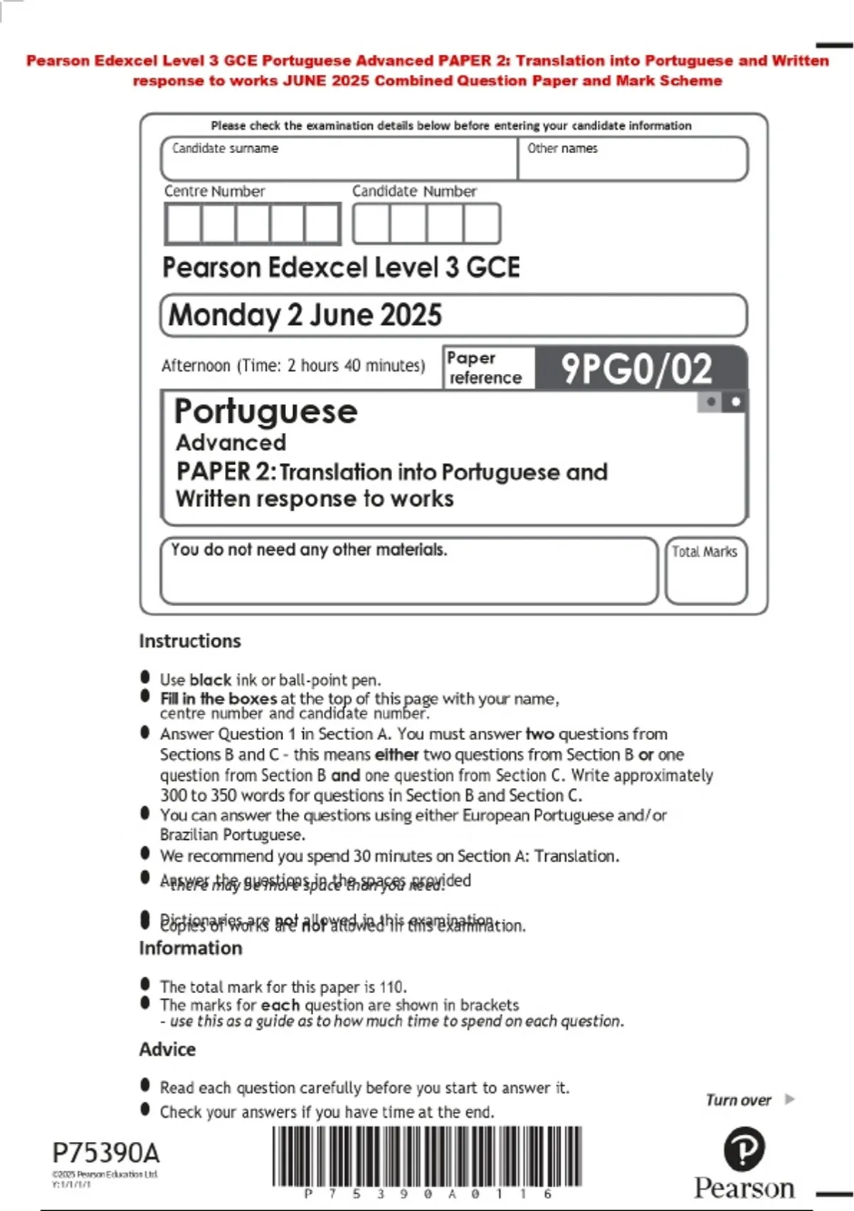 Pearson Edexcel Level 3 GCE Portuguese Advanced PAPER 2: Translation into Portuguese and Written response to works JUNE 2025 Combined Question Paper and Mark Scheme