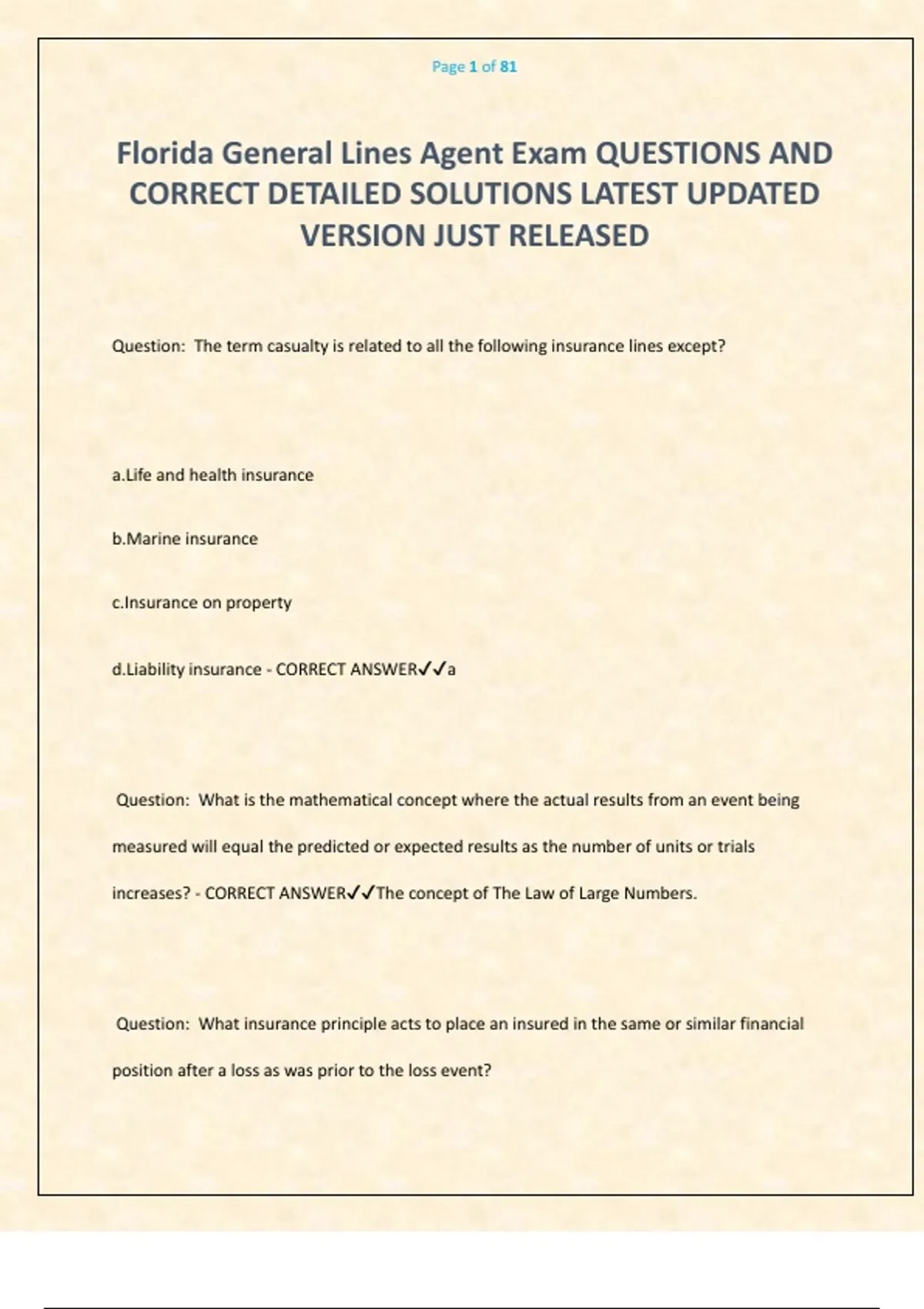 Florida General Lines Agent Exam – Latest Updated Version with Correct Detailed Solutions is a comprehensive study guide designed to help candidates prepare confidently for the Florida General Lines (Property & Casualty) licensing exam, fully aligned with the most recent updates released this year. It covers the full range of content commonly tested, including insurance principles, policy provisions, property and casualty coverages, homeowners and commercial policies, liability insurance, risk management, underwriting, claims handling, ethics, and Florida-specific insurance laws and regulations. The exam-style questions reflect real licensing exam scenarios, while the detailed solutions explain the reasoning behind each answer to strengthen understanding and application. Whether you are preparing for your first attempt or reviewing before exam day, this guide supports focused study, improves exam readiness, and helps build confidence for success on the Florida General Lines Agent exam.