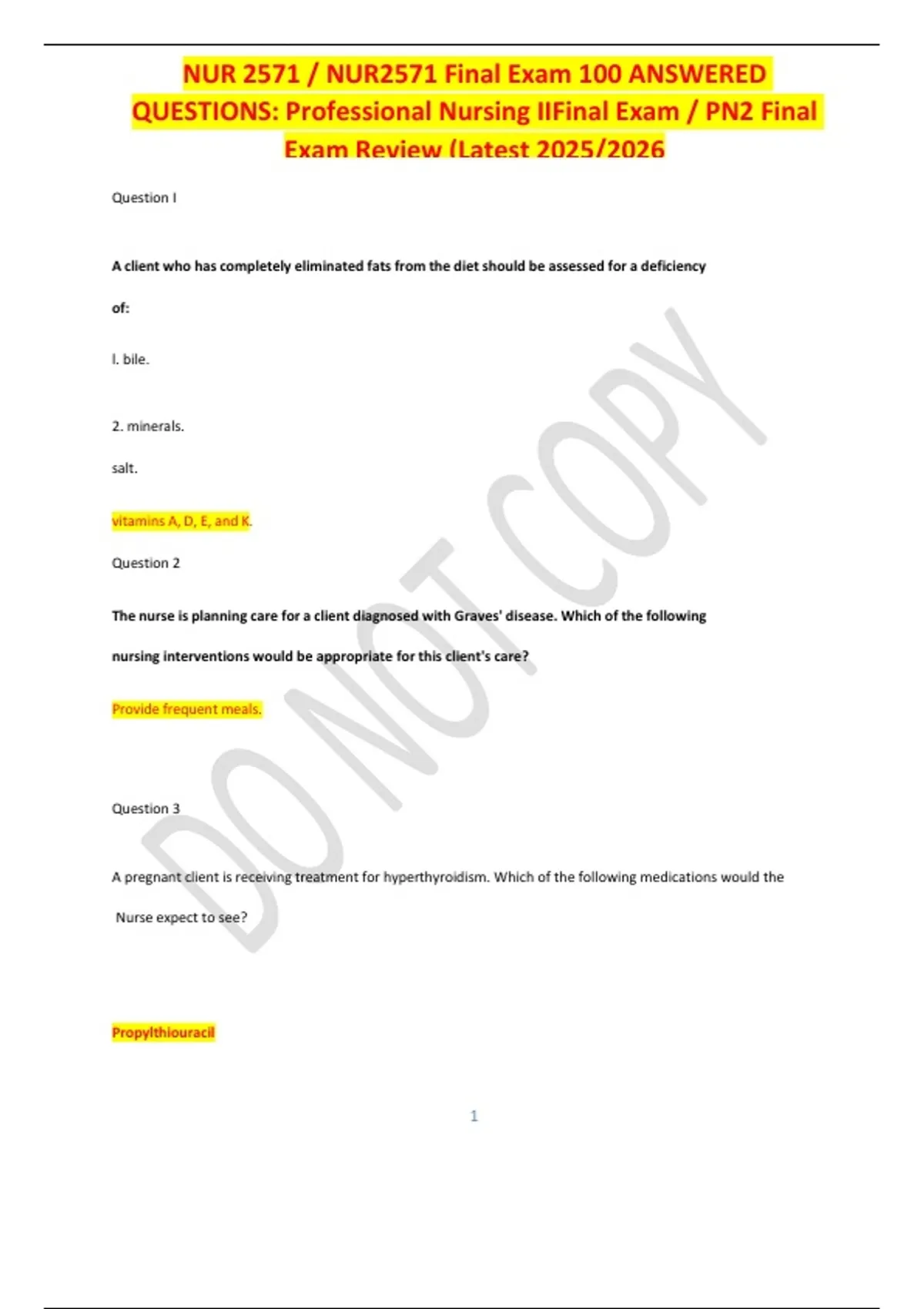 QUESTIONS: Professional Nursing IIFinal Exam / PN2 Final