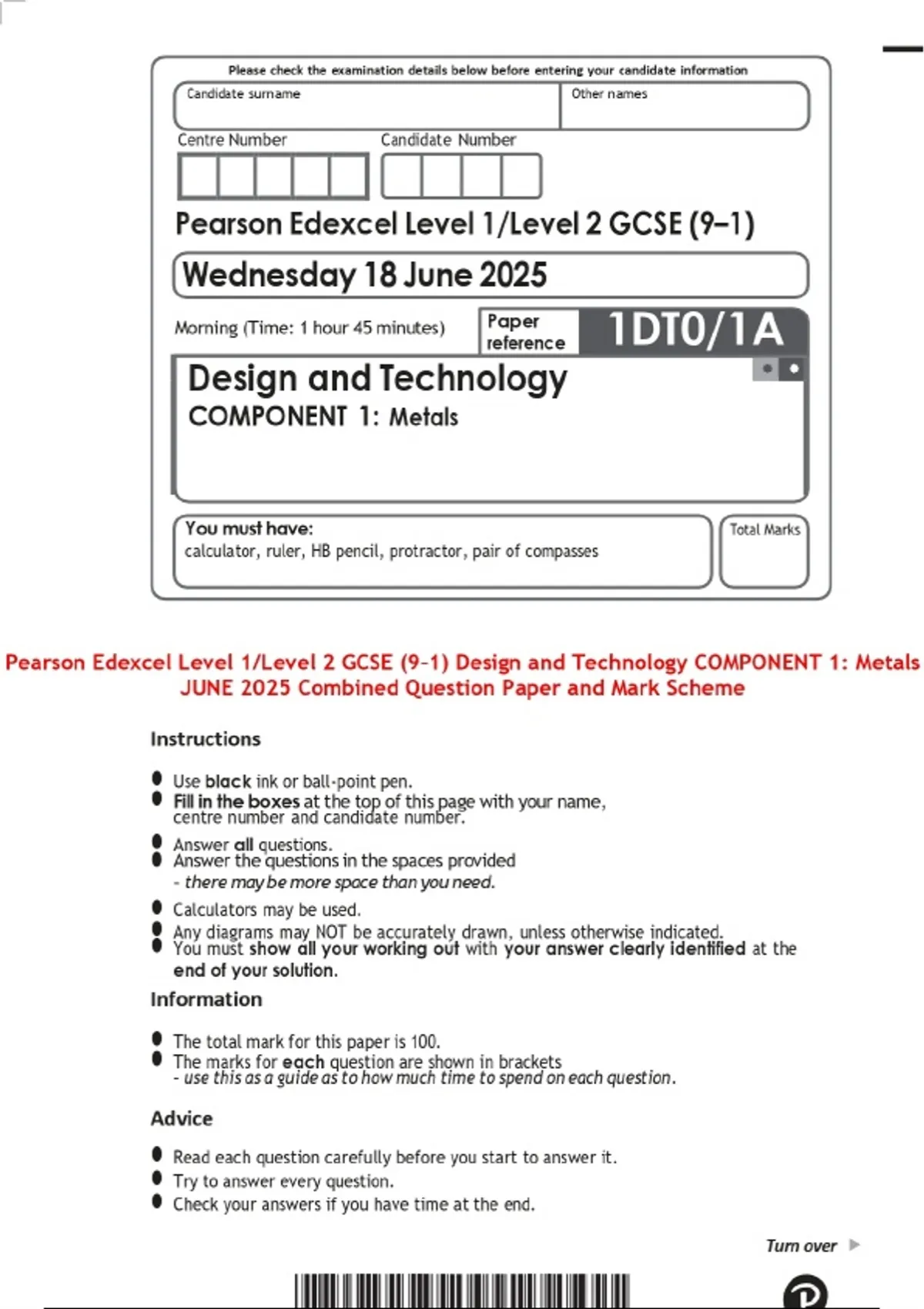 Pearson Edexcel Level 1/Level 2 GCSE (9–1) Design and Technology COMPONENT 1: Metals JUNE 2025 Combined Question Paper and Mark Scheme